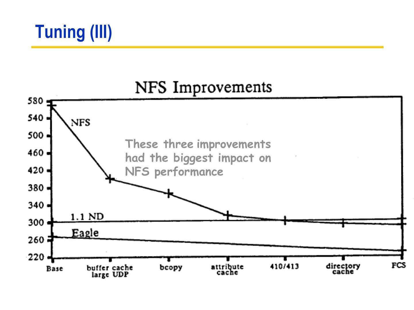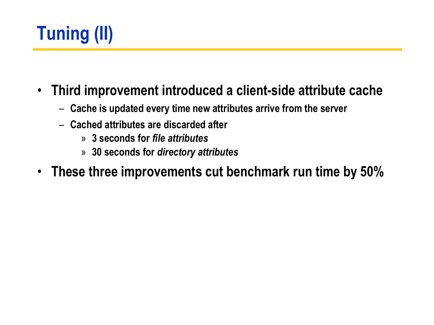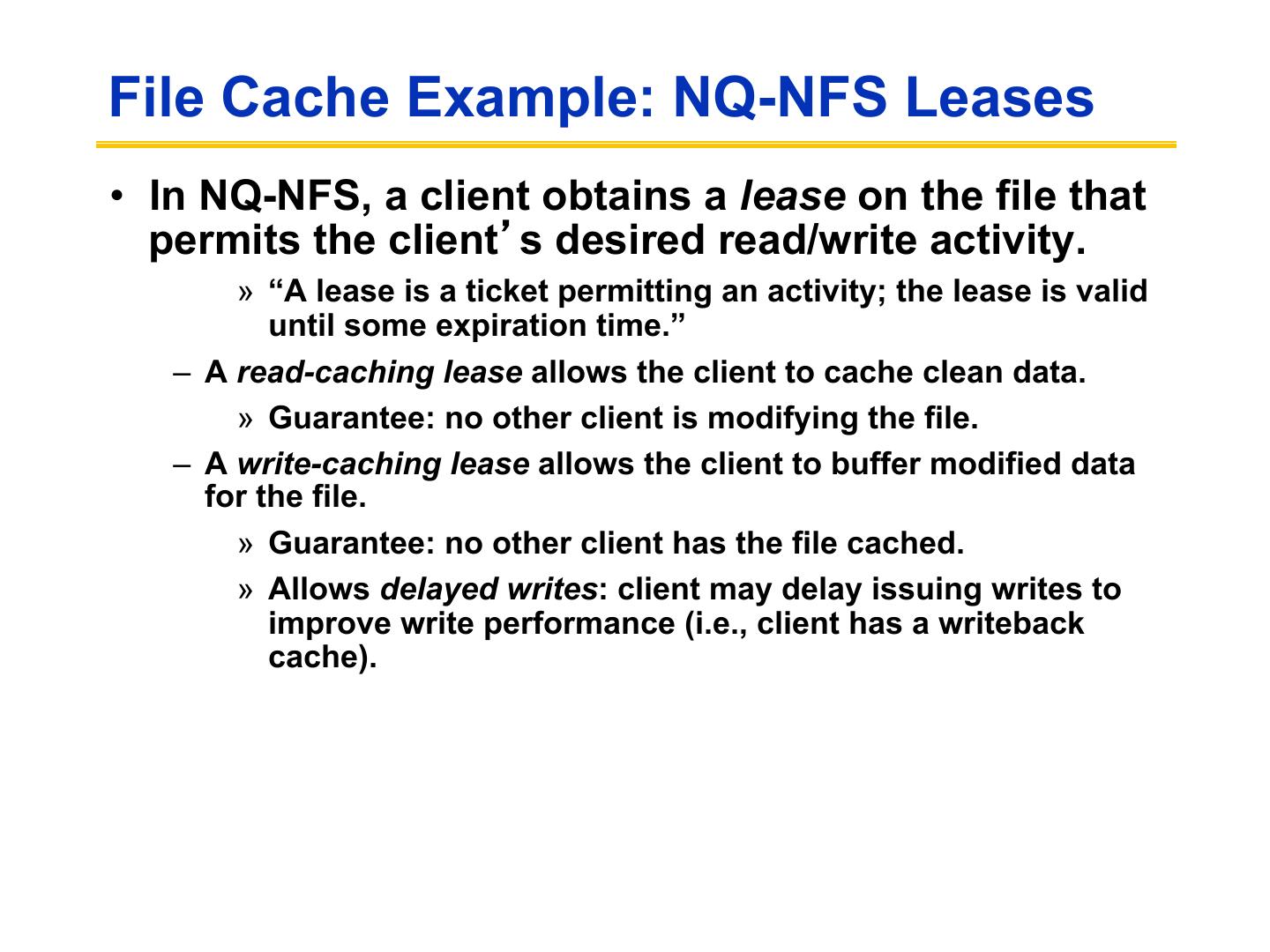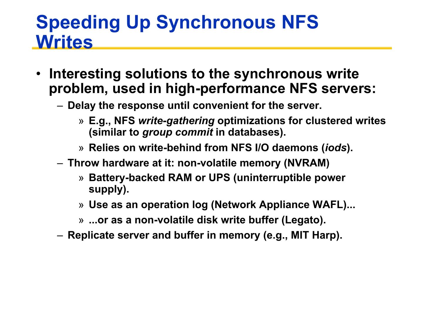 29 .Speeding Up Synchronous NFS Writes • Interesting solutions to the synchronous write problem, used in high-performance NFS servers: – Delay the response until convenient for the server. » E.g., NFS write-gathering optimizations for clustered writes (similar to group commit in databases). » Relies on write-behind from NFS I/O daemons (iods). – Throw hardware at it: non-volatile memory (NVRAM) » Battery-backed RAM or UPS (uninterruptible power supply). » Use as an operation log (Network Appliance WAFL)... » ...or as a non-volatile disk write buffer (Legato). – Replicate server and buffer in memory (e.g., MIT Harp).