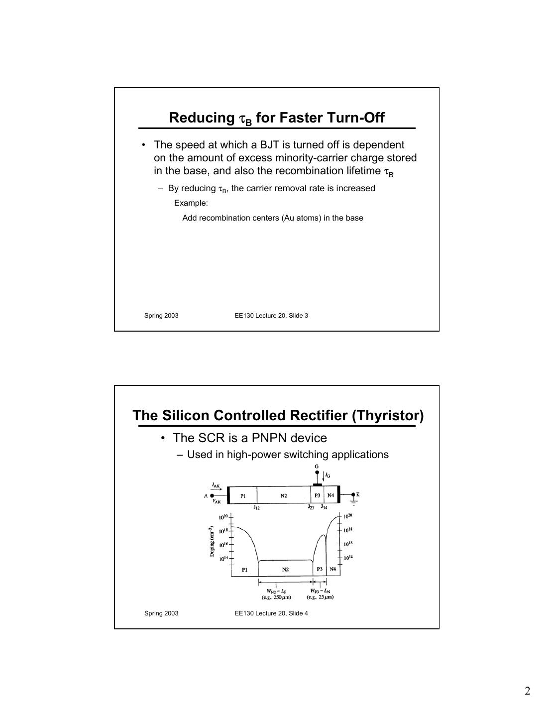 2 . Reducing τB for Faster Turn-Off • The speed at which a BJT is turned off is dependent on the amount of excess minority-carrier charge stored in the base, and also the recombination lifetime τB – By reducing τB, the carrier removal rate is increased Example: Add recombination centers (Au atoms) in the base Spring 2003 EE130 Lecture 20, Slide 3 The Silicon Controlled Rectifier (Thyristor) • The SCR is a PNPN device – Used in high-power switching applications Spring 2003 EE130 Lecture 20, Slide 4 2