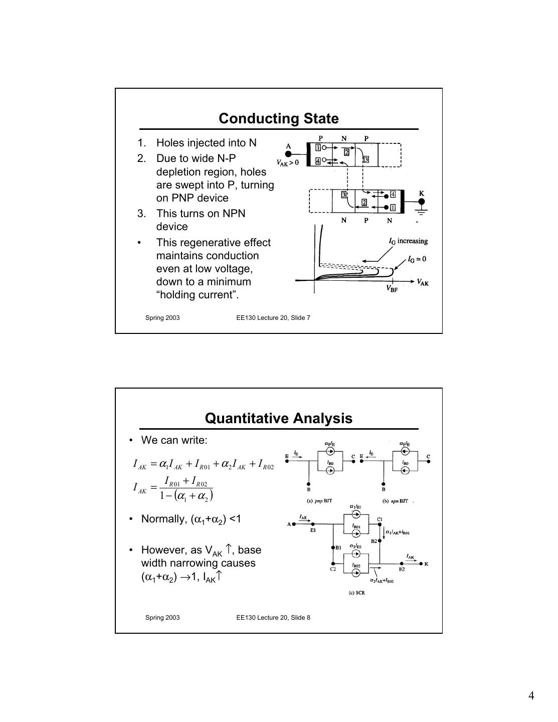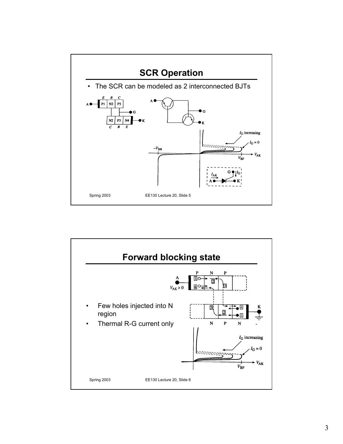 3 . SCR Operation • The SCR can be modeled as 2 interconnected BJTs Spring 2003 EE130 Lecture 20, Slide 5 Forward blocking state • Few holes injected into N region • Thermal R-G current only Spring 2003 EE130 Lecture 20, Slide 6 3