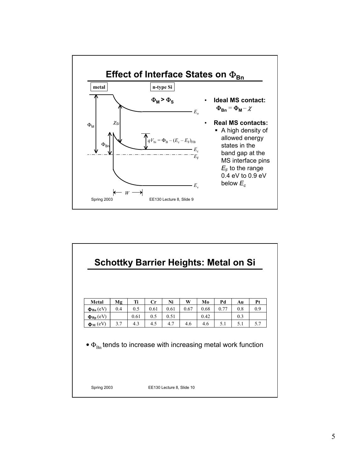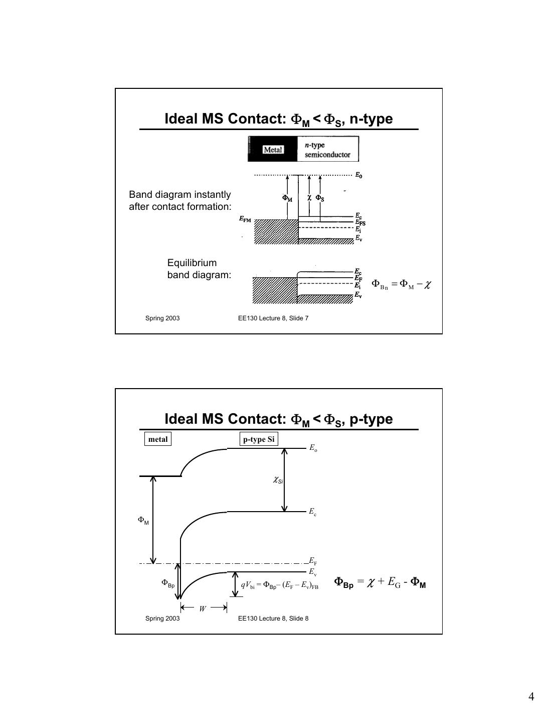 4 . Ideal MS Contact: ΦM < ΦS, n-type Band diagram instantly after contact formation: Equilibrium band diagram: Φ Bn = Φ M − χ Spring 2003 EE130 Lecture 8, Slide 7 Ideal MS Contact: ΦM < ΦS, p-type metal p-type Si Eo χSi Ec ΦM EF Ev ΦBp qVbi = ΦBp– (EF – Ev)FB ΦBp = χ + EG - ΦM W Spring 2003 EE130 Lecture 8, Slide 8 4