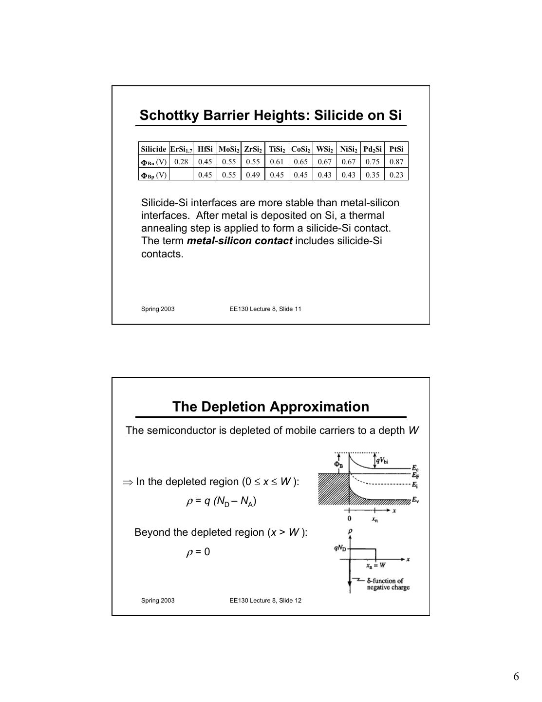 6 . Schottky Barrier Heights: Silicide on Si Silicide ErSi1.7 HfSi MoSi2 ZrSi2 TiSi2 CoSi2 WSi2 NiSi2 Pd2Si PtSi Φ Bn (V) 0.28 0.45 0.55 0.55 0.61 0.65 0.67 0.67 0.75 0.87 Φ Bp (V) 0.45 0.55 0.49 0.45 0.45 0.43 0.43 0.35 0.23 Silicide-Si interfaces are more stable than metal-silicon interfaces. After metal is deposited on Si, a thermal annealing step is applied to form a silicide-Si contact. The term metal-silicon contact includes silicide-Si contacts. Spring 2003 EE130 Lecture 8, Slide 11 The Depletion Approximation The semiconductor is depleted of mobile carriers to a depth W ⇒ In the depleted region (0 ≤ x ≤ W ): ρ = q (ND – NA) Beyond the depleted region (x > W ): ρ=0 Spring 2003 EE130 Lecture 8, Slide 12 6