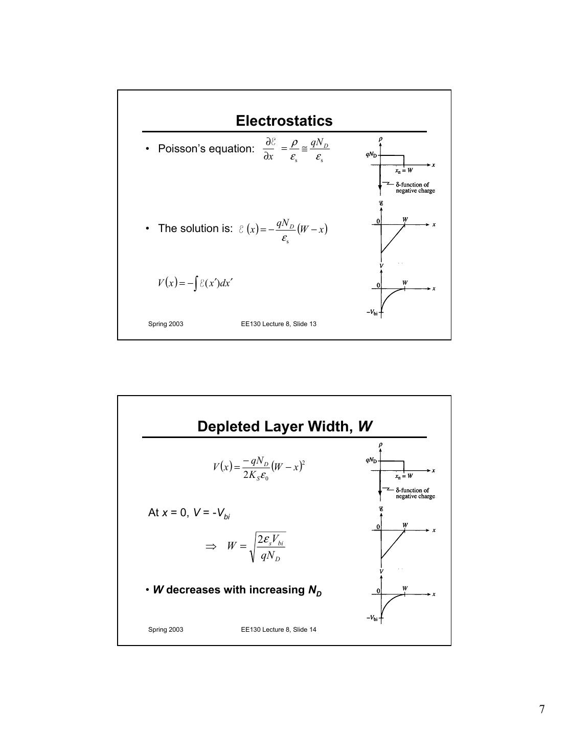 7 . Electrostatics ∂ ρ qN D • Poisson’s equation: = ≅ ∂x εs εs • The solution is: (x ) = − qN D (W − x ) εs V ( x ) = − ∫ ( x′)dx′ Spring 2003 EE130 Lecture 8, Slide 13 Depleted Layer Width, W − qN D V (x ) = (W − x )2 2K Sε 0 At x = 0, V = -Vbi 2ε sVbi ⇒ W= qN D • W decreases with increasing ND Spring 2003 EE130 Lecture 8, Slide 14 7