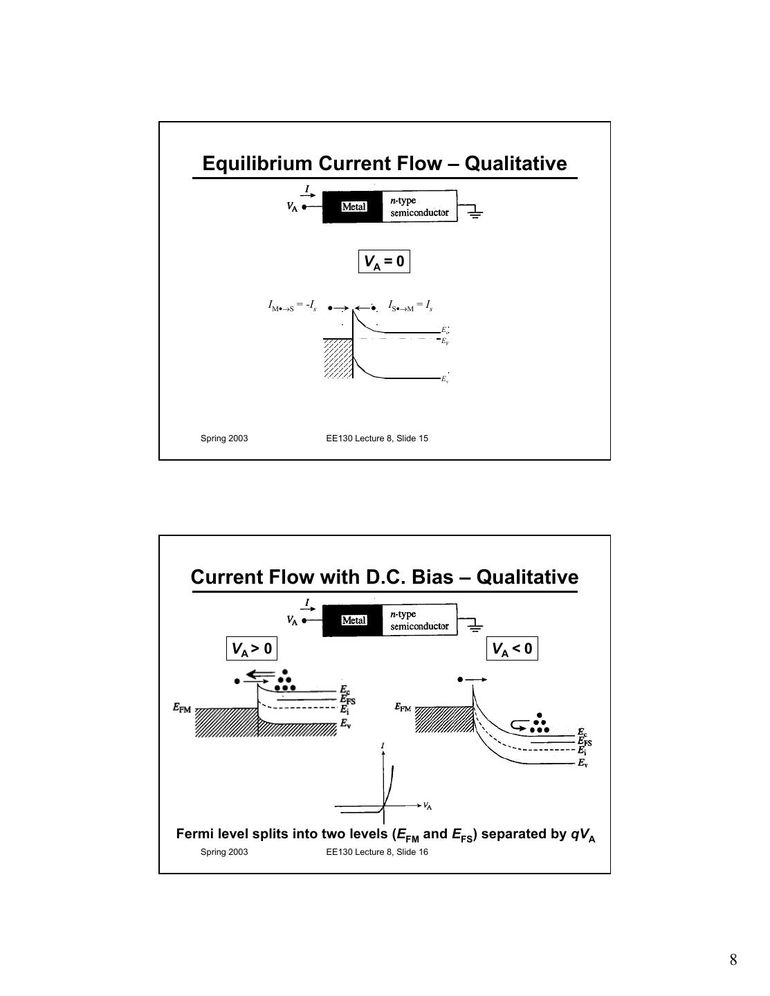 8 . Equilibrium Current Flow – Qualitative VA = 0 IM•→S = -Is IS•→M = Is Ec EF Ev Spring 2003 EE130 Lecture 8, Slide 15 Current Flow with D.C. Bias – Qualitative VA > 0 VA < 0 Fermi level splits into two levels (EFM and EFS) separated by qVA Spring 2003 EE130 Lecture 8, Slide 16 8