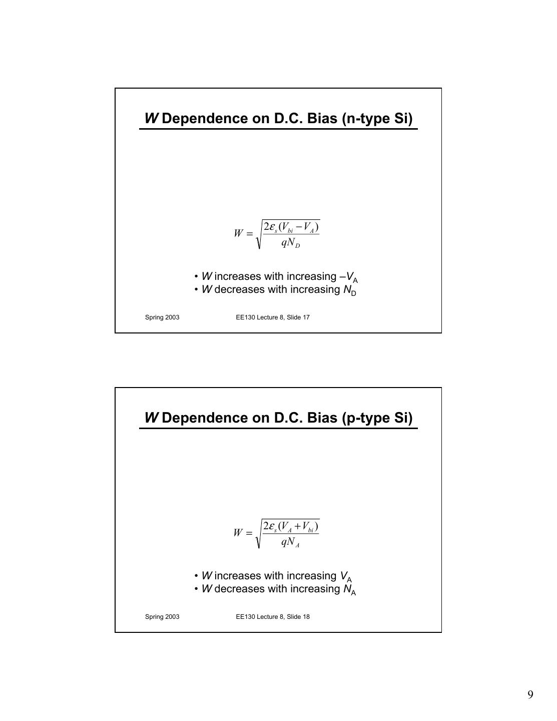9 .W Dependence on D.C. Bias (n-type Si) 2ε s (Vbi − VA ) W= qN D • W increases with increasing –VA • W decreases with increasing ND Spring 2003 EE130 Lecture 8, Slide 17 W Dependence on D.C. Bias (p-type Si) 2ε s (VA + Vbi ) W= qN A • W increases with increasing VA • W decreases with increasing NA Spring 2003 EE130 Lecture 8, Slide 18 9