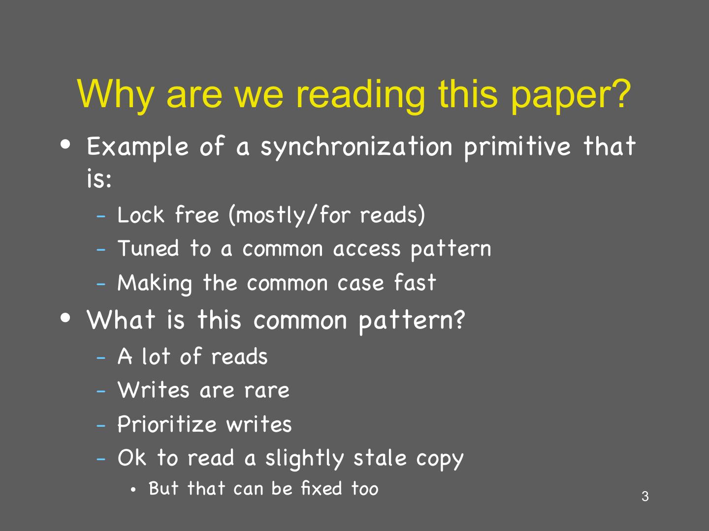 3 . Why are we reading this paper? • Example of a synchronization primitive that is: – Lock free (mostly/for reads) – Tuned to a common access pattern – Making the common case fast • What is this common pattern? – A lot of reads – Writes are rare – Prioritize writes – Ok to read a slightly stale copy • But that can be fixed too 3