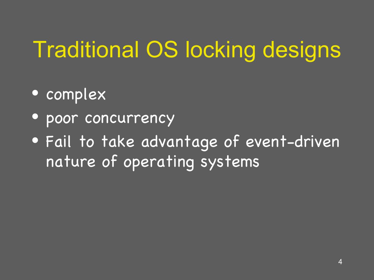 4 .Traditional OS locking designs • complex • poor concurrency • Fail to take advantage of event-driven nature of operating systems 4