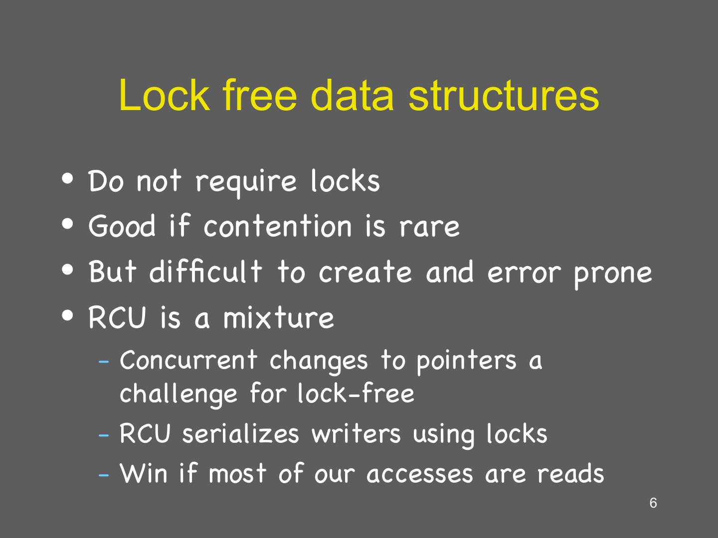 6 . Lock free data structures • Do not require locks • Good if contention is rare • But difficult to create and error prone • RCU is a mixture – Concurrent changes to pointers a challenge for lock-free – RCU serializes writers using locks – Win if most of our accesses are reads 6