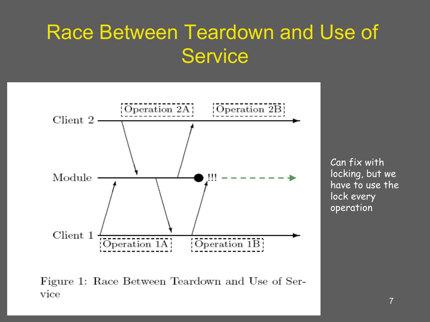 7 .Race Between Teardown and Use of Service Can fix with locking, but we have to use the lock every operation 7