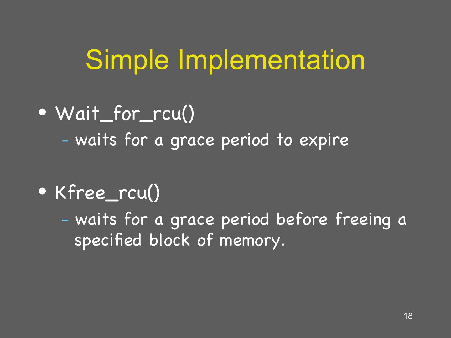 18 . Simple Implementation • Wait_for_rcu() – waits for a grace period to expire • Kfree_rcu() – waits for a grace period before freeing a specified block of memory. 18