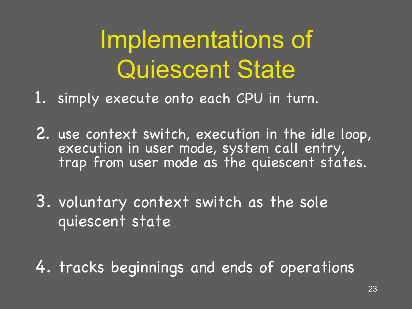 23 . Implementations of Quiescent State 1. simply execute onto each CPU in turn. 2. use context switch, execution in the idle loop, execution in user mode, system call entry, trap from user mode as the quiescent states. 3. voluntary context switch as the sole quiescent state 4. tracks beginnings and ends of operations 23
