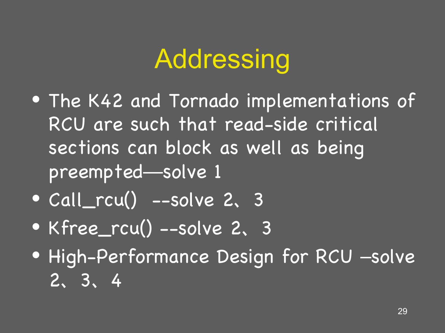 29 . Addressing • The K42 and Tornado implementations of RCU are such that read-side critical sections can block as well as being preempted—solve 1 • Call_rcu() --solve 2、3 • Kfree_rcu() --solve 2、3 • High-Performance Design for RCU –solve 2、3、4 29
