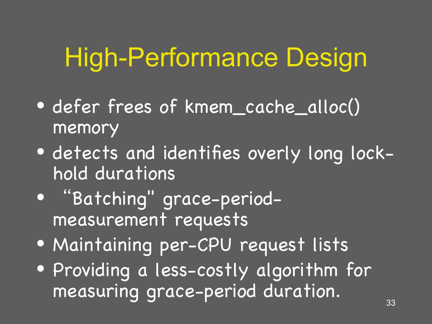 28 . Shortcomings • Does not work in a preemptible kernel unless preemption is suppressed in all read-side critical sections • Cannot be called from an interrupt handler • Should not be called while holding a spinlock or with interrupts disabled • Relatively slow 28