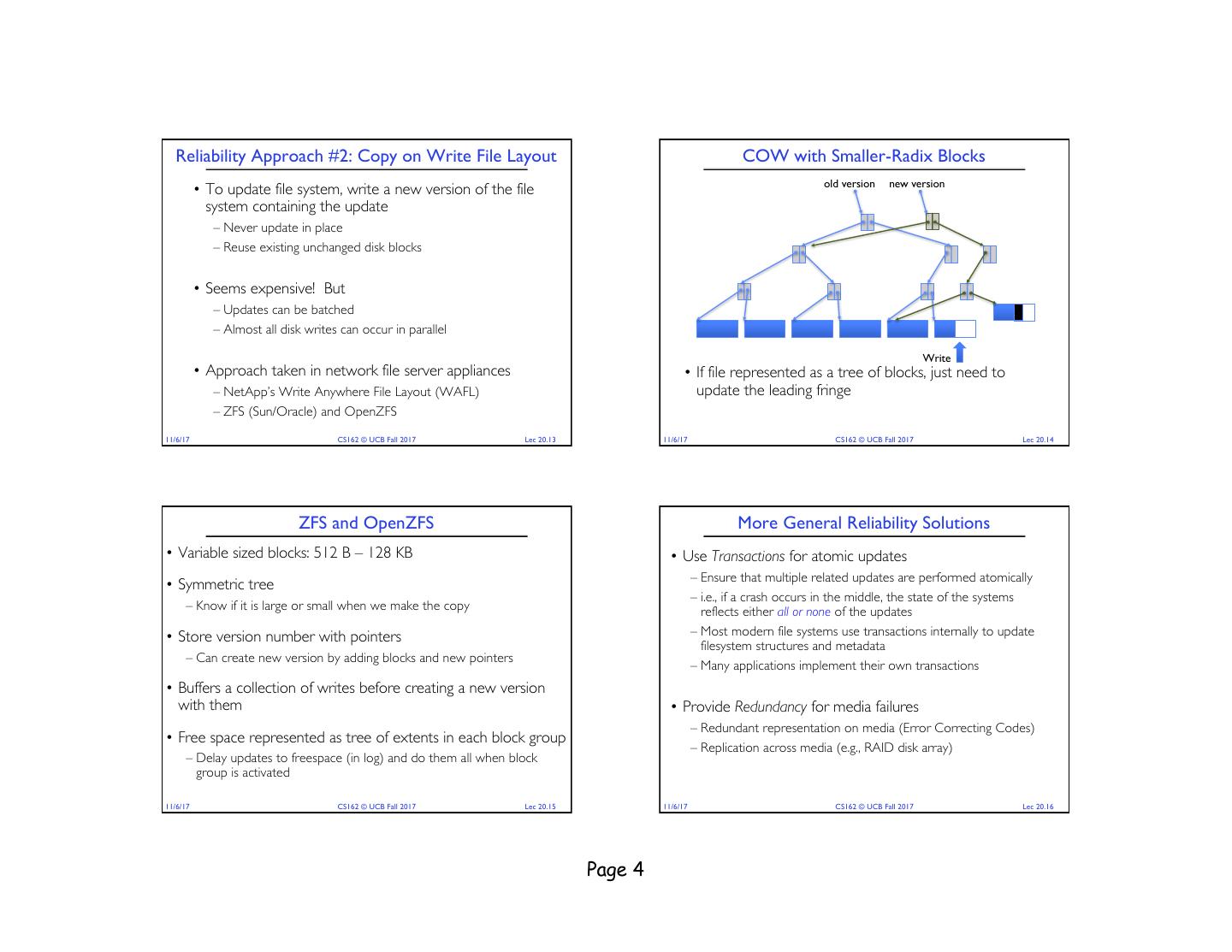 4 . Reliability Approach #2: Copy on Write File Layout COW with Smaller-Radix Blocks old version new version • To update file system, write a new version of the file system containing the update – Never update in place – Reuse existing unchanged disk blocks • Seems expensive! But – Updates can be batched – Almost all disk writes can occur in parallel Write • Approach taken in network file server appliances • If file represented as a tree of blocks, just need to – NetApp’s Write Anywhere File Layout (WAFL) update the leading fringe – ZFS (Sun/Oracle) and OpenZFS 11/6/17 CS162 © UCB Fall 2017 Lec 20.13 11/6/17 CS162 © UCB Fall 2017 Lec 20.14 ZFS and OpenZFS More General Reliability Solutions • Variable sized blocks: 512 B – 128 KB • Use Transactions for atomic updates – Ensure that multiple related updates are performed atomically • Symmetric tree – i.e., if a crash occurs in the middle, the state of the systems – Know if it is large or small when we make the copy reflects either all or none of the updates • Store version number with pointers – Most modern file systems use transactions internally to update filesystem structures and metadata – Can create new version by adding blocks and new pointers – Many applications implement their own transactions • Buffers a collection of writes before creating a new version with them • Provide Redundancy for media failures – Redundant representation on media (Error Correcting Codes) • Free space represented as tree of extents in each block group – Replication across media (e.g., RAID disk array) – Delay updates to freespace (in log) and do them all when block group is activated 11/6/17 CS162 © UCB Fall 2017 Lec 20.15 11/6/17 CS162 © UCB Fall 2017 Lec 20.16 Page 4
