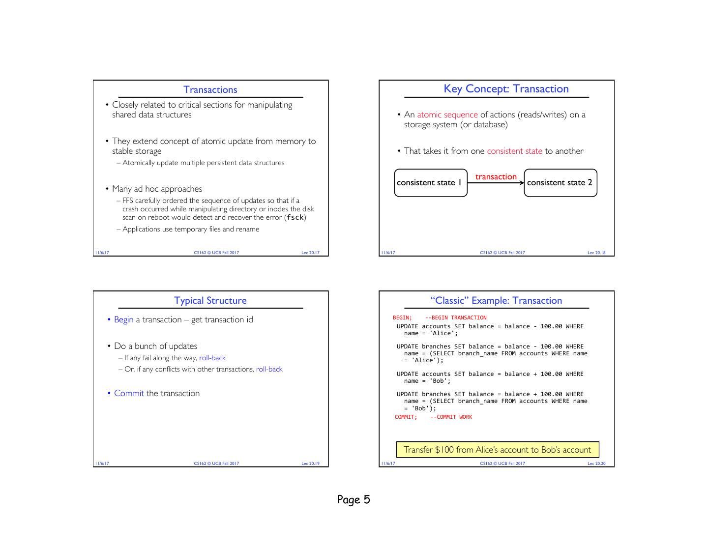 5 . Transactions Key Concept: Transaction • Closely related to critical sections for manipulating shared data structures • An atomic sequence of actions (reads/writes) on a storage system (or database) • They extend concept of atomic update from memory to stable storage • That takes it from one consistent state to another – Atomically update multiple persistent data structures transaction consistent state 1 consistent state 2 • Many ad hoc approaches – FFS carefully ordered the sequence of updates so that if a crash occurred while manipulating directory or inodes the disk scan on reboot would detect and recover the error (fsck) – Applications use temporary files and rename 11/6/17 CS162 © UCB Fall 2017 Lec 20.17 11/6/17 CS162 © UCB Fall 2017 Lec 20.18 Typical Structure “Classic” Example: Transaction • Begin a transaction – get transaction id BEGIN; --BEGIN TRANSACTION UPDATE accounts SET balance = balance - 100.00 WHERE name = 'Alice'; • Do a bunch of updates UPDATE branches SET balance = balance - 100.00 WHERE name = (SELECT branch_name FROM accounts WHERE name – If any fail along the way, roll-back = 'Alice'); – Or, if any conflicts with other transactions, roll-back UPDATE accounts SET balance = balance + 100.00 WHERE name = 'Bob'; • Commit the transaction UPDATE branches SET balance = balance + 100.00 WHERE name = (SELECT branch_name FROM accounts WHERE name = 'Bob'); COMMIT; --COMMIT WORK Transfer $100 from Alice’s account to Bob’s account 11/6/17 CS162 © UCB Fall 2017 Lec 20.19 11/6/17 CS162 © UCB Fall 2017 Lec 20.20 Page 5