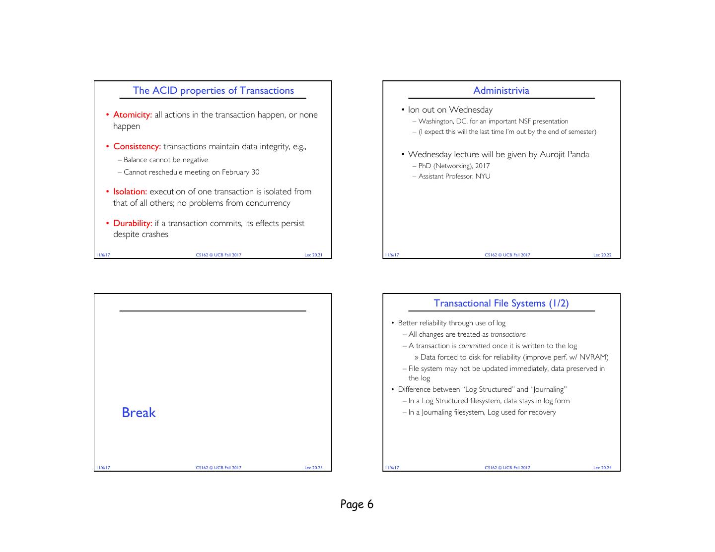 6 . The ACID properties of Transactions Administrivia • Ion out on Wednesday • Atomicity: all actions in the transaction happen, or none – Washington, DC, for an important NSF presentation happen – (I expect this will the last time I’m out by the end of semester) • Consistency: transactions maintain data integrity, e.g., • Wednesday lecture will be given by Aurojit Panda – Balance cannot be negative – PhD (Networking), 2017 – Cannot reschedule meeting on February 30 – Assistant Professor, NYU • Isolation: execution of one transaction is isolated from that of all others; no problems from concurrency • Durability: if a transaction commits, its effects persist despite crashes 11/6/17 CS162 © UCB Fall 2017 Lec 20.21 11/6/17 CS162 © UCB Fall 2017 Lec 20.22 Transactional File Systems (1/2) • Better reliability through use of log – All changes are treated as transactions – A transaction is committed once it is written to the log » Data forced to disk for reliability (improve perf. w/ NVRAM) – File system may not be updated immediately, data preserved in the log • Difference between “Log Structured” and “Journaling” – In a Log Structured filesystem, data stays in log form Break – In a Journaling filesystem, Log used for recovery 11/6/17 CS162 © UCB Fall 2017 Lec 20.23 11/6/17 CS162 © UCB Fall 2017 Lec 20.24 Page 6