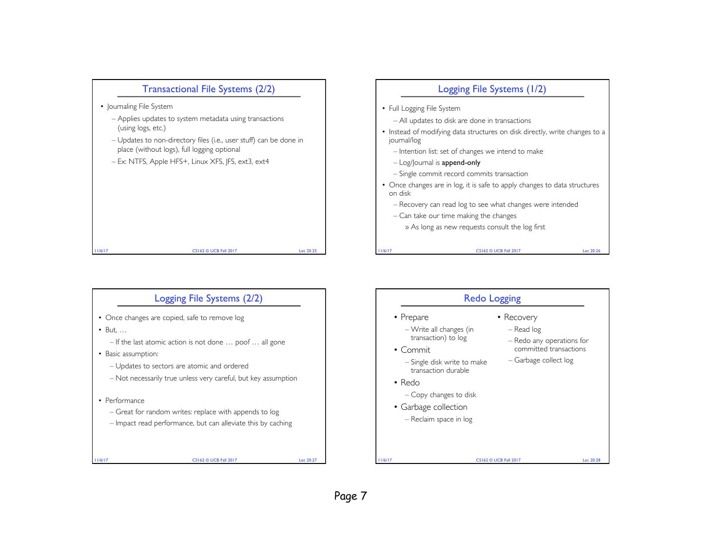 7 . Transactional File Systems (2/2) Logging File Systems (1/2) • Journaling File System • Full Logging File System – Applies updates to system metadata using transactions – All updates to disk are done in transactions (using logs, etc.) • Instead of modifying data structures on disk directly, write changes to a – Updates to non-directory files (i.e., user stuff) can be done in journal/log place (without logs), full logging optional – Intention list: set of changes we intend to make – Ex: NTFS, Apple HFS+, Linux XFS, JFS, ext3, ext4 – Log/Journal is append-only – Single commit record commits transaction • Once changes are in log, it is safe to apply changes to data structures on disk – Recovery can read log to see what changes were intended – Can take our time making the changes » As long as new requests consult the log first 11/6/17 CS162 © UCB Fall 2017 Lec 20.25 11/6/17 CS162 © UCB Fall 2017 Lec 20.26 Logging File Systems (2/2) Redo Logging • Once changes are copied, safe to remove log • Prepare • Recovery • But, … – Write all changes (in – Read log transaction) to log – Redo any operations for – If the last atomic action is not done … poof … all gone • Commit committed transactions • Basic assumption: – Single disk write to make – Garbage collect log – Updates to sectors are atomic and ordered transaction durable – Not necessarily true unless very careful, but key assumption • Redo – Copy changes to disk • Performance – Great for random writes: replace with appends to log • Garbage collection – Reclaim space in log – Impact read performance, but can alleviate this by caching 11/6/17 CS162 © UCB Fall 2017 Lec 20.27 11/6/17 CS162 © UCB Fall 2017 Lec 20.28 Page 7