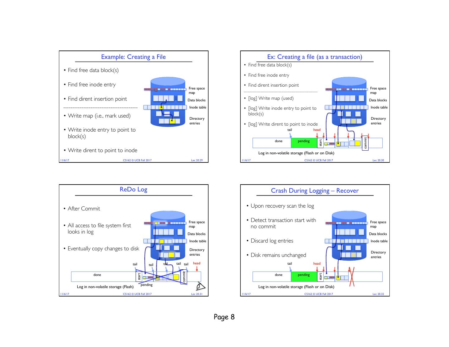 8 . Example: Creating a File Ex: Creating a file (as a transaction) • Find free data block(s) • Find free data block(s) • Find free inode entry • Find free inode entry • Find dirent insertion point Free space Free space map --------------------------------------------------------- map • Find dirent insertion point • [log] Write map (used) … … Data blocks Data blocks ----------------------------------------- Inode table • [log] Write inode entry to point to Inode table • Write map (i.e., mark used) block(s) Directory Directory entries • [log] Write dirent to point to inode entries • Write inode entry to point to tail head block(s) commit done pending start • Write dirent to point to inode Log in non-volatile storage (Flash or on Disk) 11/6/17 CS162 © UCB Fall 2017 Lec 20.29 11/6/17 CS162 © UCB Fall 2017 Lec 20.30 ReDo Log Crash During Logging – Recover • After Commit • Upon recovery scan the log Free space • Detect transaction start with Free space • All access to file system first map no commit map looks in log … … Data blocks Data blocks Inode table • Discard log entries Inode table • Eventually copy changes to disk Directory Directory entries • Disk remains unchanged entries tail tail tail tail tail head tail head commit done done pending start start pending Log in non-volatile storage (Flash) Log in non-volatile storage (Flash or on Disk) 11/6/17 CS162 © UCB Fall 2017 Lec 20.31 11/6/17 CS162 © UCB Fall 2017 Lec 20.32 Page 8