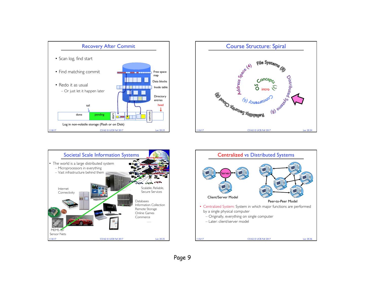 9 . Recovery After Commit Course Structure: Spiral • Scan log, find start • Find matching commit Free space map … Data blocks • Redo it as usual Inode table – Or just let it happen later intro Directory entries tail head commit done pending start Log in non-volatile storage (Flash or on Disk) 11/6/17 CS162 © UCB Fall 2017 Lec 20.33 11/6/17 CS162 © UCB Fall 2017 Lec 20.34 Societal Scale Information Systems Massive Cluster Centralized vs Distributed Systems • The world is a large distributed system Gigabit Ethernet – Microprocessors in everything Clusters Massive Cluster – Vast infrastructure behind them Gigabit EthernetClusters Server Internet Scalable, Reliable, Connectivity Secure Services Client/Server Model Databases Peer-to-Peer Model Information Collection • Centralized System: System in which major functions are performed Remote Storage Online Games by a single physical computer Commerce – Originally, everything on single computer … – Later: client/server model MEMS for Sensor Nets 11/6/17 CS162 © UCB Fall 2017 Lec 20.35 11/6/17 CS162 © UCB Fall 2017 Lec 20.36 Page 9