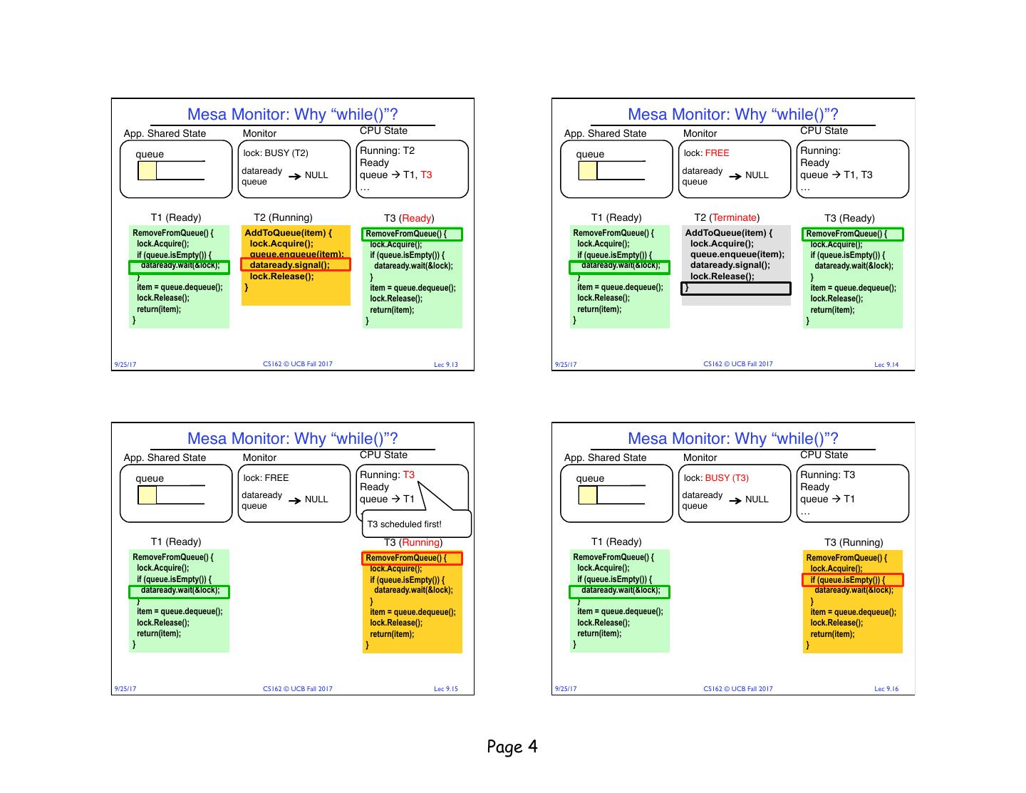2 . Mesa monitors Mesa Monitor: Why “while()”? • Signaler keeps lock and processor • Why do we use “while()” instead of “if() with Mesa monitors? • Waiter placed on ready queue with no special priority – Example illustrating what happens if we use “if()”, e.g., • Practically, need to check condition again after wait if (queue.isEmpty()) { • Most real operating systems dataready.wait(&lock); // If nothing, sleep } … Put waiting lock.Acquire() • We’ll use the synchronized (infinite) queue example lock.Acquire() thread on … … ready queue while (queue.isEmpty()) { AddToQueue(item) { RemoveFromQueue() { dataready.signal(); dataready.wait(&lock); lock.Acquire(); ad lock.Acquire(); … thre } if (queue.isEmpty()) { w a iting queue.enqueue(item); lock.Release(); dule … dataready.wait(&lock); dataready.signal(); sche lock.Release(); } lock.Release(); item = queue.dequeue(); } lock.Release(); Replace “while” with return(item); “if” } 9/25/17 CS162 © UCB Fall 2017 Lec 9.5 9/25/17 CS162 © UCB Fall 2017 Lec 9.6 Mesa Monitor: Why “while()”? Mesa Monitor: Why “while()”? App. Shared State Monitor CPU State App. Shared State Monitor CPU State queue lock: FREE Running: T1 queue lock: BUSY (T1) Running: T1 Ready Ready dataready dataready NULL queue à NULL NULL queue à NULL queue queue … … T1 (Running) T1 (Running) RemoveFromQueue() { RemoveFromQueue() { lock.Acquire(); lock.Acquire(); if (queue.isEmpty()) { if (queue.isEmpty()) { dataready.wait(&lock); dataready.wait(&lock); } } item = queue.dequeue(); item = queue.dequeue(); lock.Release(); lock.Release(); return(item); return(item); } } 9/25/17 CS162 © UCB Fall 2017 Lec 9.7 9/25/17 CS162 © UCB Fall 2017 Lec 9.8 Page 2