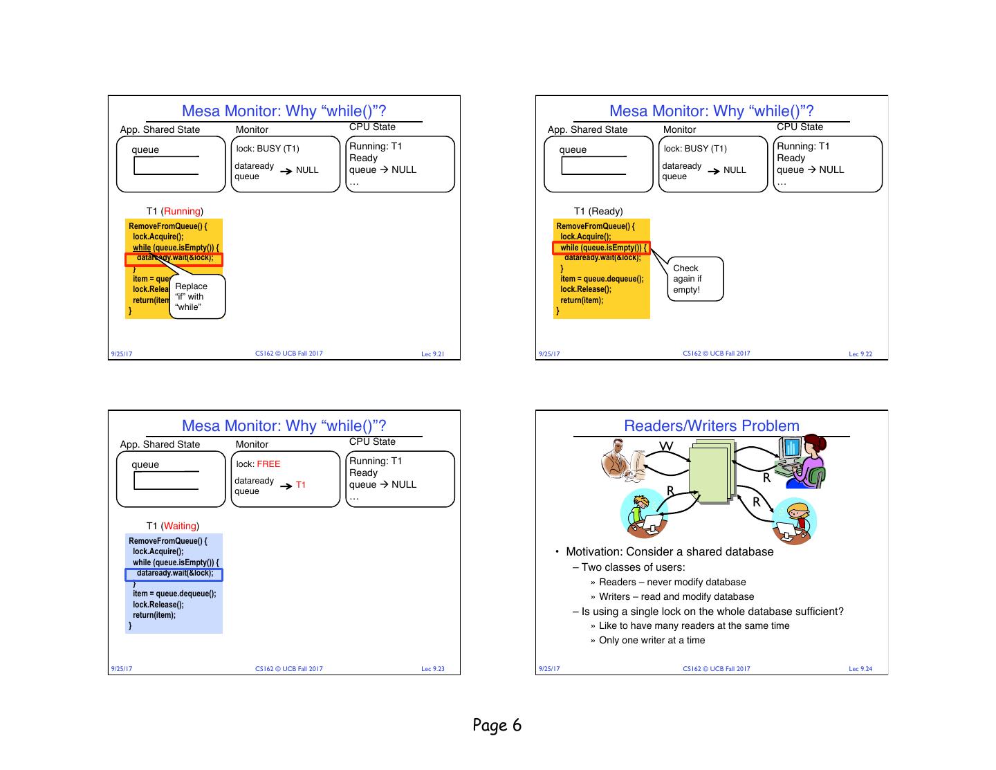6 . Mesa Monitor: Why “while()”? Mesa Monitor: Why “while()”? App. Shared State Monitor CPU State App. Shared State Monitor CPU State queue lock: BUSY (T1) Running: T1 queue lock: BUSY (T1) Running: T1 Ready Ready dataready dataready NULL queue à NULL NULL queue à NULL queue queue … … T1 (Running) T1 (Ready) RemoveFromQueue() { RemoveFromQueue() { lock.Acquire(); lock.Acquire(); while (queue.isEmpty()) { while (queue.isEmpty()) { dataready.wait(&lock); dataready.wait(&lock); } } Check item = queue.dequeue(); item = queue.dequeue(); again if Replace lock.Release(); lock.Release(); empty! return(item);“if” with return(item); } “while” } 9/25/17 CS162 © UCB Fall 2017 Lec 9.21 9/25/17 CS162 © UCB Fall 2017 Lec 9.22 Mesa Monitor: Why “while()”? Readers/Writers Problem CPU State App. Shared State Monitor W queue lock: FREE Running: T1 Ready dataready T1 queue à NULL R queue … R R T1 (Waiting) RemoveFromQueue() { lock.Acquire(); • Motivation: Consider a shared database while (queue.isEmpty()) { dataready.wait(&lock); – Two classes of users: } » Readers – never modify database item = queue.dequeue(); » Writers – read and modify database lock.Release(); return(item); – Is using a single lock on the whole database sufficient? } » Like to have many readers at the same time » Only one writer at a time 9/25/17 CS162 © UCB Fall 2017 Lec 9.23 9/25/17 CS162 © UCB Fall 2017 Lec 9.24 Page 6
