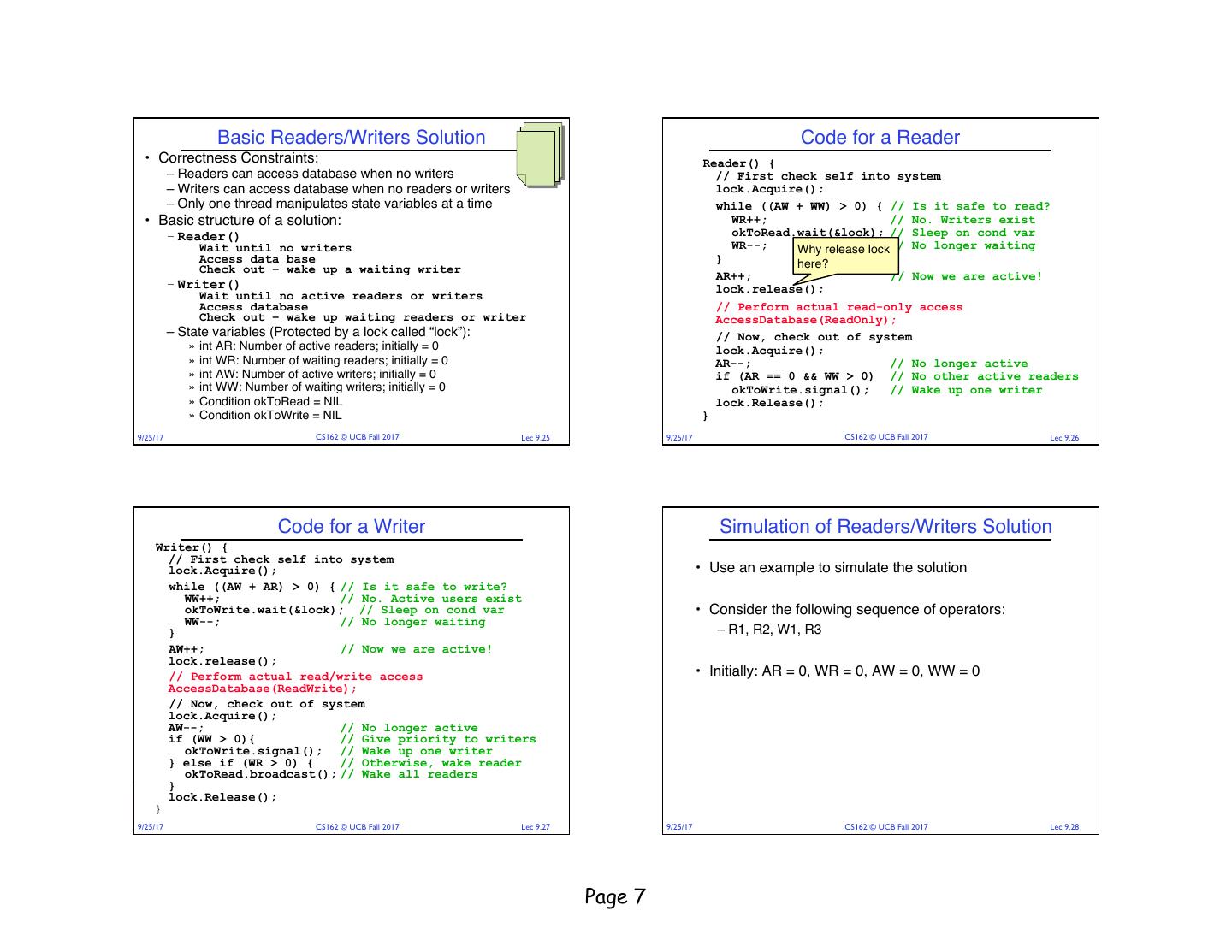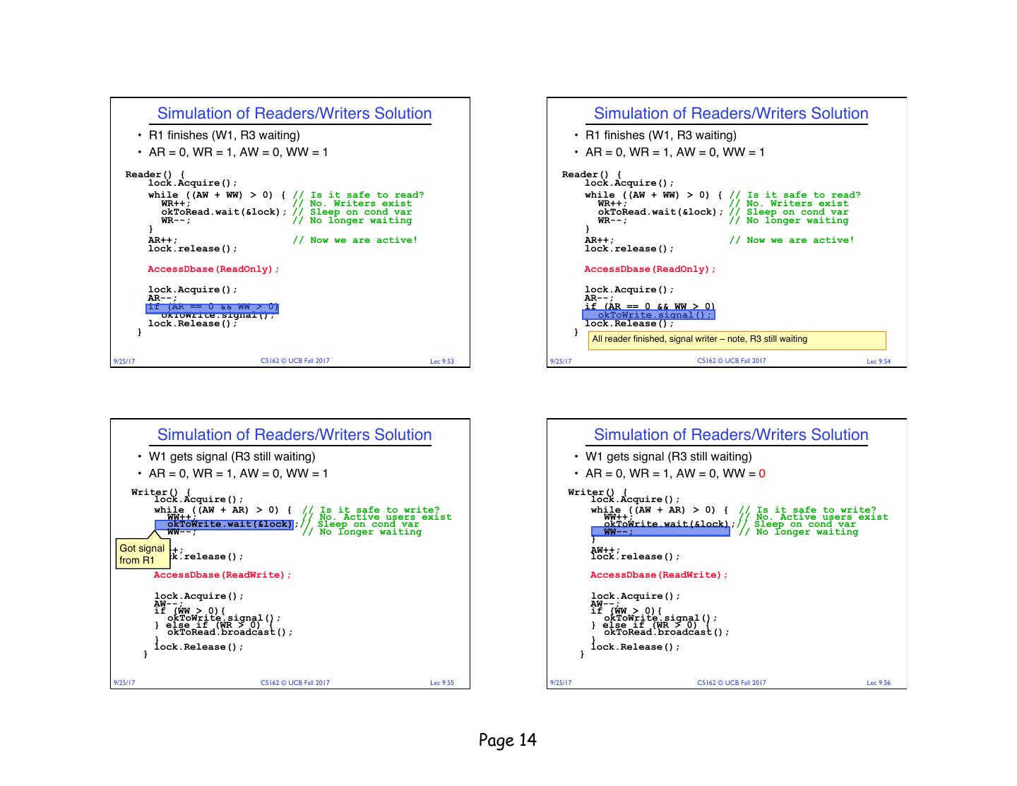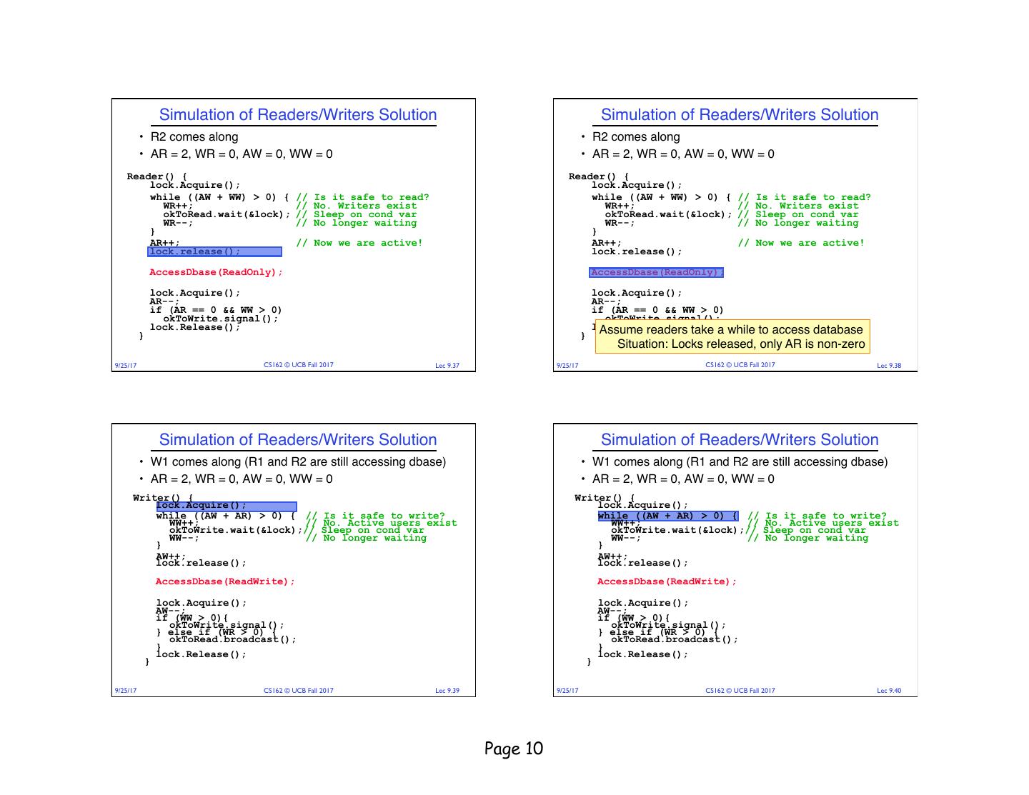 18 . Read/Writer Questions Read/Writer Questions Reader() { Writer() { Writer() { // check into system // check into system Reader() { lock.Acquire(); lock.Acquire(); // check into system // check into system lock.Acquire(); lock.Acquire(); while ((AW + WW) > 0) { while ((AW + AR) > 0) { WW++; while ((AW + WW) > 0) { while ((AW + AR) > 0) { WR++; okContinue.wait(&lock); WW++; okContinue.wait(&lock); WW--; WR++; okContinue.wait(&lock); } okContinue.wait(&lock); WW--; WR--; WR--; } } AW++; } AW++; AR++; lock.release(); AR++; lock.release(); lock.release(); lock.release(); // read/write access // read/write access AccessDbase(ReadWrite); AccessDbase(ReadWrite); // read-only access // read-only access AccessDbase(ReadOnly); // check out of system AccessDbase(ReadOnly); lock.Acquire(); // check out of system AW--; lock.Acquire(); // check out of system if (WW > 0){ // check out of system AW--; lock.Acquire(); okContinue.signal(); lock.Acquire(); if (WW > 0){ AR--; } else if (WR > 0) { okContinue.signal(); if (AR == 0 && WW > 0) okContinue.broadcast(); AR--; } else if (WR > 0) { okContinue.signal(); } if (AR == 0 && WW > 0) okContinue.broadcast(); lock.Release(); okContinue.signal(); } lock.Release(); lock.Release(); } } lock.Release(); } } • R1 arrives • W1, R2 arrive while R1 still reading à W1 and R2 wait for R1 to finish What if we turn okToWrite and okToRead into okContinue? • Assume R1’s signal is delivered to R2 (not W1) 9/25/17 CS162 © UCB Fall 2017 Lec 9.69 9/25/17 CS162 © UCB Fall 2017 Lec 9.70 Read/Writer Questions Administrivia Reader() { Writer() { // check into system // check into system lock.Acquire(); • Midterm on Thursday 9/28 6:30-8PM lock.Acquire(); while ((AW + WW) > 0) { while ((AW + AR) > 0) { WW++; WR++; okContinue.wait(&lock); okContinue.wait(&lock); WR--; } WW--; • Closed book, no calculators, one double-side letter-sized } AW++; page of handwritten notes AR++; lock.release(); lock.release(); // read/write access AccessDbase(ReadWrite); // read-only access AccessDbase(ReadOnly); // check out of system lock.Acquire(); // check out of system AW--; if (WW > 0){ lock.Acquire(); okContinue.signal(); AR--; } else if (WR > 0) { if (AR == 0 && WW > 0) okContinue.broadcast(); okContinue.broadcast(); } lock.Release(); lock.Release(); } } Need to change to broadcast! 9/25/17 CS162 © UCB Fall 2017 Lec 9.71 9/25/17 CS162 © UCB Fall 2017 Lec 9.72 Page 18