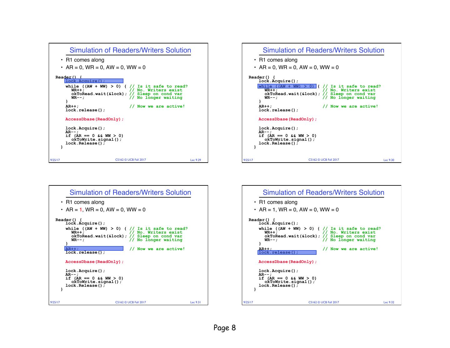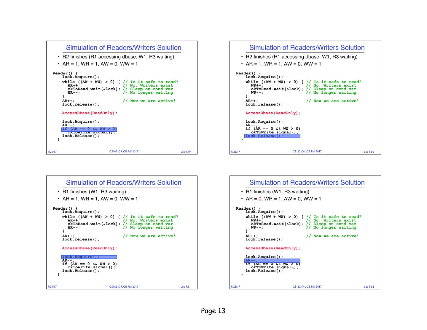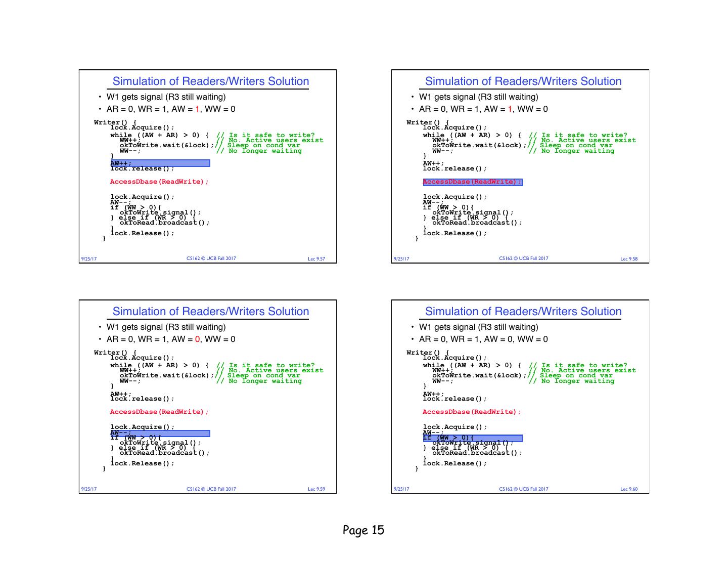 18 . Read/Writer Questions Read/Writer Questions Reader() { Writer() { Writer() { // check into system // check into system Reader() { lock.Acquire(); lock.Acquire(); // check into system // check into system lock.Acquire(); lock.Acquire(); while ((AW + WW) > 0) { while ((AW + AR) > 0) { WW++; while ((AW + WW) > 0) { while ((AW + AR) > 0) { WR++; okContinue.wait(&lock); WW++; okContinue.wait(&lock); WW--; WR++; okContinue.wait(&lock); } okContinue.wait(&lock); WW--; WR--; WR--; } } AW++; } AW++; AR++; lock.release(); AR++; lock.release(); lock.release(); lock.release(); // read/write access // read/write access AccessDbase(ReadWrite); AccessDbase(ReadWrite); // read-only access // read-only access AccessDbase(ReadOnly); // check out of system AccessDbase(ReadOnly); lock.Acquire(); // check out of system AW--; lock.Acquire(); // check out of system if (WW > 0){ // check out of system AW--; lock.Acquire(); okContinue.signal(); lock.Acquire(); if (WW > 0){ AR--; } else if (WR > 0) { okContinue.signal(); if (AR == 0 && WW > 0) okContinue.broadcast(); AR--; } else if (WR > 0) { okContinue.signal(); } if (AR == 0 && WW > 0) okContinue.broadcast(); lock.Release(); okContinue.signal(); } lock.Release(); lock.Release(); } } lock.Release(); } } • R1 arrives • W1, R2 arrive while R1 still reading à W1 and R2 wait for R1 to finish What if we turn okToWrite and okToRead into okContinue? • Assume R1’s signal is delivered to R2 (not W1) 9/25/17 CS162 © UCB Fall 2017 Lec 9.69 9/25/17 CS162 © UCB Fall 2017 Lec 9.70 Read/Writer Questions Administrivia Reader() { Writer() { // check into system // check into system lock.Acquire(); • Midterm on Thursday 9/28 6:30-8PM lock.Acquire(); while ((AW + WW) > 0) { while ((AW + AR) > 0) { WW++; WR++; okContinue.wait(&lock); okContinue.wait(&lock); WR--; } WW--; • Closed book, no calculators, one double-side letter-sized } AW++; page of handwritten notes AR++; lock.release(); lock.release(); // read/write access AccessDbase(ReadWrite); // read-only access AccessDbase(ReadOnly); // check out of system lock.Acquire(); // check out of system AW--; if (WW > 0){ lock.Acquire(); okContinue.signal(); AR--; } else if (WR > 0) { if (AR == 0 && WW > 0) okContinue.broadcast(); okContinue.broadcast(); } lock.Release(); lock.Release(); } } Need to change to broadcast! 9/25/17 CS162 © UCB Fall 2017 Lec 9.71 9/25/17 CS162 © UCB Fall 2017 Lec 9.72 Page 18