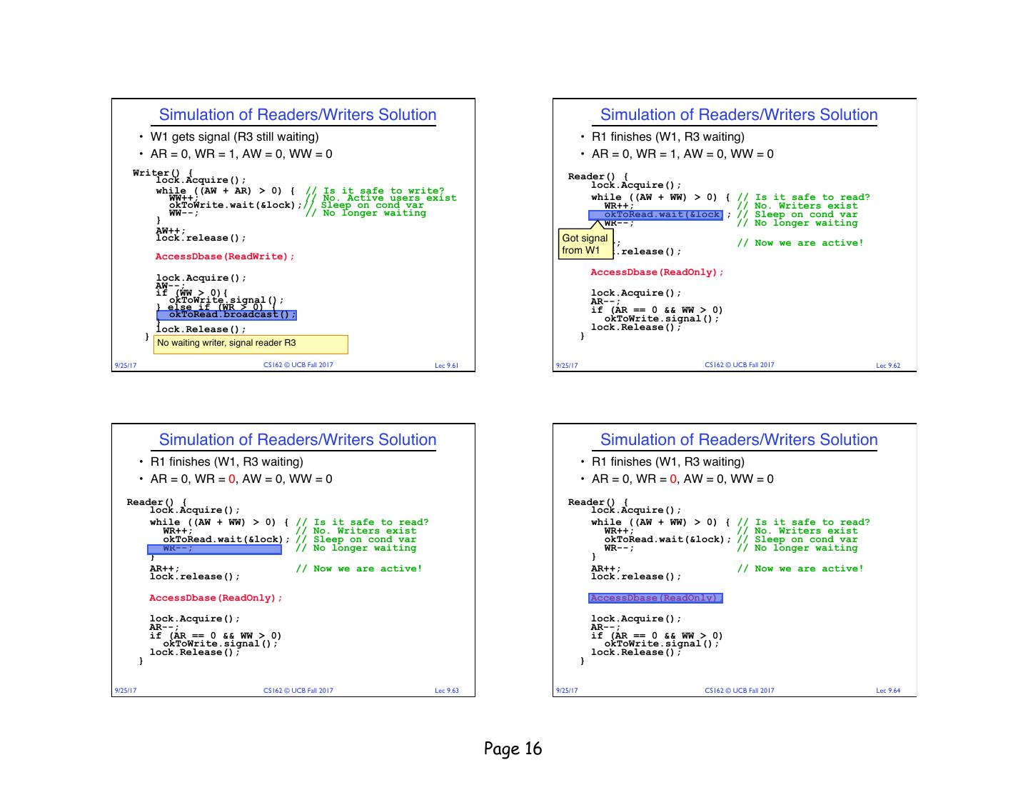 17 . Simulation of Readers/Writers Solution Simulation of Readers/Writers Solution • R1 finishes (W1, R3 waiting) • R1 finishes (W1, R3 waiting) • AR = 0, WR = 0, AW = 0, WW = 0 • AR = 0, WR = 0, AW = 0, WW = 0 Reader() { Reader() { lock.Acquire(); lock.Acquire(); while ((AW + WW) > 0) { // Is it safe to read? while ((AW + WW) > 0) { // Is it safe to read? WR++; // No. Writers exist WR++; // No. Writers exist okToRead.wait(&lock); // Sleep on cond var okToRead.wait(&lock); // Sleep on cond var WR--; // No longer waiting WR--; // No longer waiting } } AR++; // Now we are active! AR++; // Now we are active! lock.release(); lock.release(); AccessDbase(ReadOnly); AccessDbase(ReadOnly); lock.Acquire(); lock.Acquire(); AR--; AR--; if (AR == 0 && WW > 0) if (AR == 0 && WW > 0) okToWrite.signal(); okToWrite.signal(); lock.Release(); lock.Release(); } } DONE! 9/25/17 CS162 © UCB Fall 2017 Lec 9.65 9/25/17 CS162 © UCB Fall 2017 Lec 9.66 Read/Writer Questions Read/Writer Questions Reader() { Writer() { Reader() { Writer() { // check into system // check into system // check into system // check into system lock.Acquire(); lock.Acquire(); lock.Acquire(); lock.Acquire(); while ((AW + WW) > 0) { while ((AW + AR) > 0) { while ((AW + WW) > 0) { while ((AW + AR) > 0) { WW++; WW++; WR++; okToWrite.wait(&lock); WR++; okToWrite.wait(&lock); okToRead.wait(&lock); WW--; okToRead.wait(&lock); WW--; WR--; } WR--; } } AW++; } AW++; AR++; lock.release(); AR++; lock.release(); lock.release(); lock.release(); // read/write access // read/write access AccessDbase(ReadWrite); AccessDbase(ReadWrite); // read-only What if we access // read-only access AccessDbase(ReadOnly); remove this AccessDbase(ReadOnly); What if we turn line? // check out of system // check out of system lock.Acquire(); signal to lock.Acquire(); // check out of system AW--; // check out broadcast? of system AW--; if (WW > 0){ if (WW > 0){ lock.Acquire(); okToWrite.signal(); lock.Acquire(); okToWrite.signal(); AR--; } else if (WR > 0) { AR--; } else if (WR > 0) { if (AR == 0 && WW > 0) okToRead.broadcast(); if (AR == 0 && WW > 0) okToRead.broadcast(); okToWrite.signal(); } okToWrite.broadcast(); } lock.Release(); lock.Release(); lock.Release(); lock.Release(); } } } } 9/25/17 CS162 © UCB Fall 2017 Lec 9.67 9/25/17 CS162 © UCB Fall 2017 Lec 9.68 Page 17
