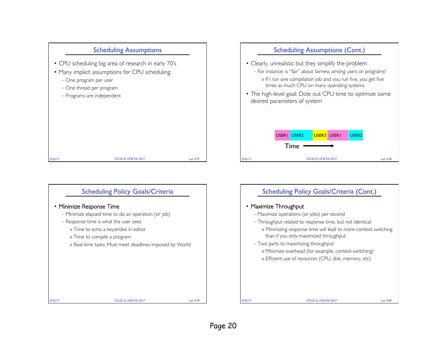 20 . Scheduling Assumptions Scheduling Assumptions (Cont.) • CPU scheduling big area of research in early 70’s • Clearly, unrealistic but they simplify the problem • Many implicit assumptions for CPU scheduling: – For instance: is “fair” about fairness among users or programs? – One program per user » If I run one compilation job and you run five, you get five – One thread per program times as much CPU on many operating systems – Programs are independent • The high-level goal: Dole out CPU time to optimize some desired parameters of system USER1 USER2 USER3 USER1 USER2 Time 9/25/17 CS162 © UCB Fall 2017 Lec 9.77 9/25/17 CS162 © UCB Fall 2017 Lec 9.78 Scheduling Policy Goals/Criteria Scheduling Policy Goals/Criteria (Cont.) • Minimize Response Time • Maximize Throughput – Minimize elapsed time to do an operation (or job) – Maximize operations (or jobs) per second – Response time is what the user sees: – Throughput related to response time, but not identical: » Time to echo a keystroke in editor » Minimizing response time will lead to more context switching » Time to compile a program than if you only maximized throughput » Real-time tasks: Must meet deadlines imposed by World – Two parts to maximizing throughput » Minimize overhead (for example, context-switching) » Efficient use of resources (CPU, disk, memory, etc) 9/25/17 CS162 © UCB Fall 2017 Lec 9.79 9/25/17 CS162 © UCB Fall 2017 Lec 9.80 Page 20