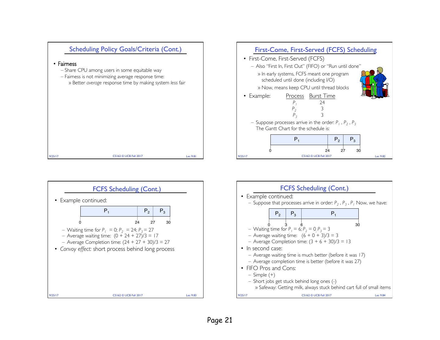 21 . Scheduling Policy Goals/Criteria (Cont.) First-Come, First-Served (FCFS) Scheduling • First-Come, First-Served (FCFS) • Fairness – Also “First In, First Out” (FIFO) or “Run until done” – Share CPU among users in some equitable way » In early systems, FCFS meant one program – Fairness is not minimizing average response time: scheduled until done (including I/O) » Better average response time by making system less fair » Now, means keep CPU until thread blocks • Example: Process Burst Time P1 24 P2 3 P3 3 – Suppose processes arrive in the order: P1 , P2 , P3 The Gantt Chart for the schedule is: P1 P2 P3 0 24 27 30 9/25/17 CS162 © UCB Fall 2017 Lec 9.81 9/25/17 CS162 © UCB Fall 2017 Lec 9.82 FCFS Scheduling (Cont.) FCFS Scheduling (Cont.) • Example continued: • Example continued: – Suppose that processes arrive in order: P2 , P3 , P1 Now, we have: P1 P2 P3 P2 P3 P1 0 24 27 30 0 3 6 30 – Waiting time for P1 = 0; P2 = 24; P3 = 27 – Waiting time for P1 = 6; P2 = 0; P3 = 3 – Average waiting time: (0 + 24 + 27)/3 = 17 – Average waiting time: (6 + 0 + 3)/3 = 3 – Average Completion time: (24 + 27 + 30)/3 = 27 – Average Completion time: (3 + 6 + 30)/3 = 13 • Convoy effect: short process behind long process • In second case: – Average waiting time is much better (before it was 17) – Average completion time is better (before it was 27) • FIFO Pros and Cons: – Simple (+) – Short jobs get stuck behind long ones (-) » Safeway: Getting milk, always stuck behind cart full of small items 9/25/17 CS162 © UCB Fall 2017 Lec 9.83 9/25/17 CS162 © UCB Fall 2017 Lec 9.84 Page 21