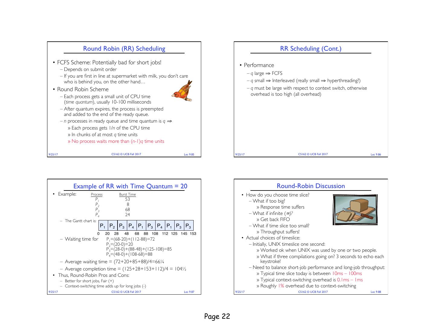 22 . Round Robin (RR) Scheduling RR Scheduling (Cont.) • FCFS Scheme: Potentially bad for short jobs! • Performance – Depends on submit order – q large ⇒ FCFS – If you are first in line at supermarket with milk, you don’t care who is behind you, on the other hand… – q small ⇒ Interleaved (really small ⇒ hyperthreading?) • Round Robin Scheme – q must be large with respect to context switch, otherwise – Each process gets a small unit of CPU time overhead is too high (all overhead) (time quantum), usually 10-100 milliseconds – After quantum expires, the process is preempted and added to the end of the ready queue. – n processes in ready queue and time quantum is q ⇒ » Each process gets 1/n of the CPU time » In chunks of at most q time units » No process waits more than (n-1)q time units 9/25/17 CS162 © UCB Fall 2017 Lec 9.85 9/25/17 CS162 © UCB Fall 2017 Lec 9.86 Example of RR with Time Quantum = 20 Round-Robin Discussion • Example: Process Burst Time • How do you choose time slice? P1 53 – What if too big? P2 8 P3 68 » Response time suffers P4 24 – What if infinite (∞)? – The Gantt chart is: » Get back FIFO P1 P2 P3 P4 P1 P3 P4 P1 P3 P3 – What if time slice too small? 0 20 28 48 68 88 108 112 125 145 153 » Throughput suffers! – Waiting time for P1=(68-20)+(112-88)=72 • Actual choices of timeslice: P2=(20-0)=20 – Initially, UNIX timeslice one second: P3=(28-0)+(88-48)+(125-108)=85 » Worked ok when UNIX was used by one or two people. P4=(48-0)+(108-68)=88 » What if three compilations going on? 3 seconds to echo each – Average waiting time = (72+20+85+88)/4=66¼ keystroke! – Average completion time = (125+28+153+112)/4 = 104½ – Need to balance short-job performance and long-job throughput: • Thus, Round-Robin Pros and Cons: » Typical time slice today is between 10ms – 100ms – Better for short jobs, Fair (+) » Typical context-switching overhead is 0.1ms – 1ms – Context-switching time adds up for long jobs (-) » Roughly 1% overhead due to context-switching 9/25/17 CS162 © UCB Fall 2017 Lec 9.87 9/25/17 CS162 © UCB Fall 2017 Lec 9.88 Page 22