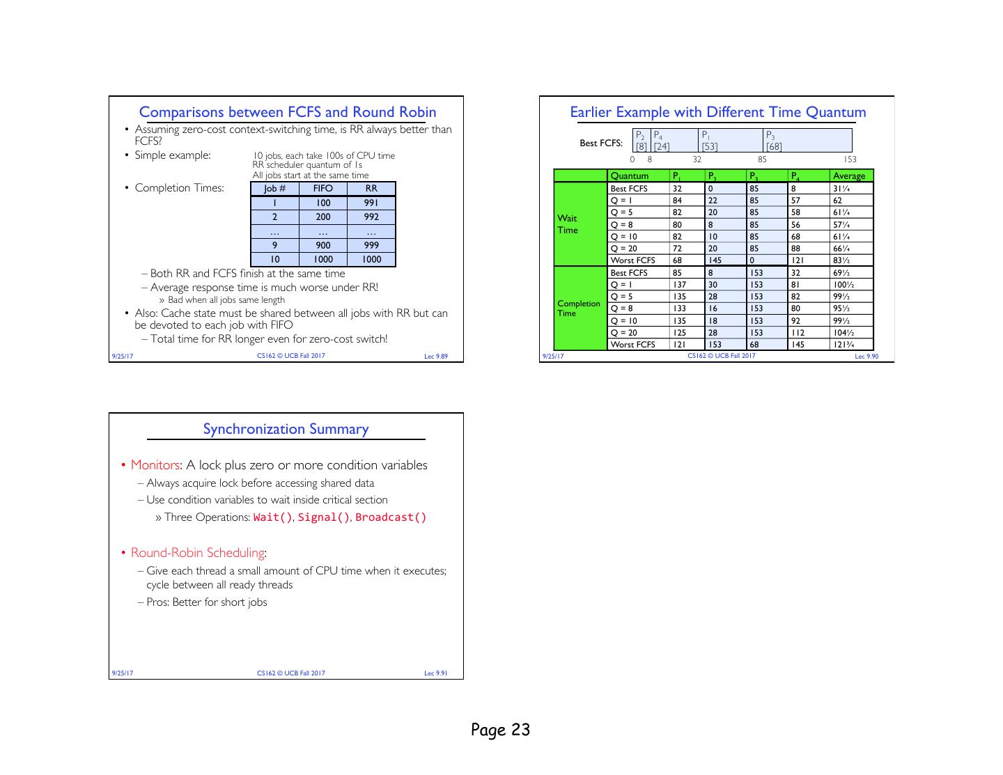 23 . Comparisons between FCFS and Round Robin Earlier Example with Different Time Quantum • Assuming zero-cost context-switching time, is RR always better than P2 P4 P1 P3 FCFS? Best FCFS: [8] [24] [53] [68] • Simple example: 10 jobs, each take 100s of CPU time 0 8 32 85 153 RR scheduler quantum of 1s All jobs start at the same time Quantum P1 P2 P3 P4 Average • Completion Times: Job # FIFO RR Best FCFS 32 0 85 8 31¼ 1 100 991 Q=1 84 22 85 57 62 Q=5 82 20 85 58 61¼ 2 200 992 Wait Q=8 80 8 85 56 57¼ … … … Time Q = 10 82 10 85 68 61¼ 9 900 999 Q = 20 72 20 85 88 66¼ 10 1000 1000 Worst FCFS 68 145 0 121 83½ – Both RR and FCFS finish at the same time Best FCFS 85 8 153 32 69½ – Average response time is much worse under RR! Q=1 137 30 153 81 100½ » Bad when all jobs same length Q=5 135 28 153 82 99½ Completion Q=8 133 16 153 80 95½ • Also: Cache state must be shared between all jobs with RR but can Time Q = 10 135 18 153 92 99½ be devoted to each job with FIFO Q = 20 125 28 153 112 104½ – Total time for RR longer even for zero-cost switch! Worst FCFS 121 153 68 145 121¾ 9/25/17 CS162 © UCB Fall 2017 Lec 9.89 9/25/17 CS162 © UCB Fall 2017 Lec 9.90 Synchronization Summary • Monitors: A lock plus zero or more condition variables – Always acquire lock before accessing shared data – Use condition variables to wait inside critical section » Three Operations: Wait(), Signal(), Broadcast() • Round-Robin Scheduling: – Give each thread a small amount of CPU time when it executes; cycle between all ready threads – Pros: Better for short jobs 9/25/17 CS162 © UCB Fall 2017 Lec 9.91 Page 23