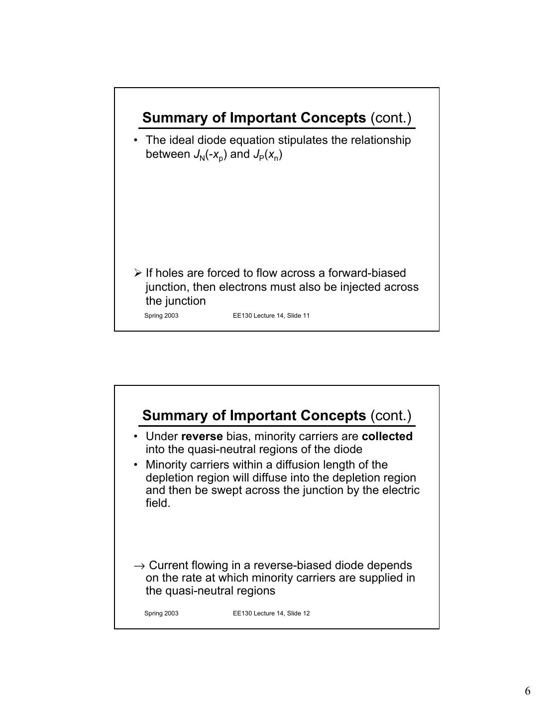 5 . • If τp is large, then the time required to turn on the diode is approximately ∆Q/IF where ∆Q = ∆Q p + ∆Q j Spring 2003 EE130 Lecture 14, Slide 9 Summary of Important Concepts • Under forward bias, minority carriers are injected into the quasi-neutral regions of the diode • Current flowing across junction is comprised of hole and electron components • In order for one of these components to be dominant, the junction must be asymmetrically doped Spring 2003 EE130 Lecture 14, Slide 10 5