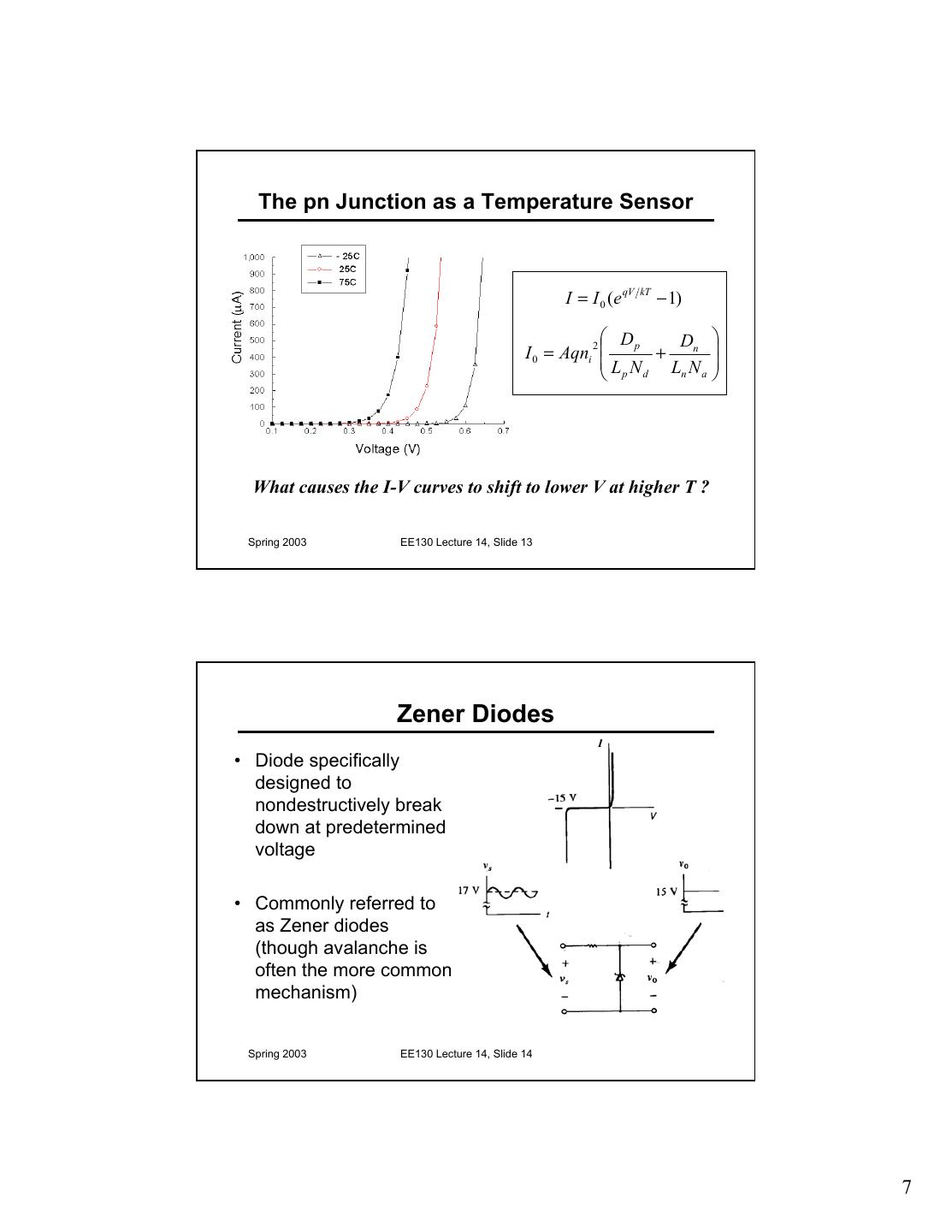7 . The pn Junction as a Temperature Sensor I = I 0 (e qV kT − 1) Dp D I 0 = Aqni + n 2 L N p d Ln N a What causes the I-V curves to shift to lower V at higher T ? Spring 2003 EE130 Lecture 14, Slide 13 Zener Diodes • Diode specifically designed to nondestructively break down at predetermined voltage • Commonly referred to as Zener diodes (though avalanche is often the more common mechanism) Spring 2003 EE130 Lecture 14, Slide 14 7