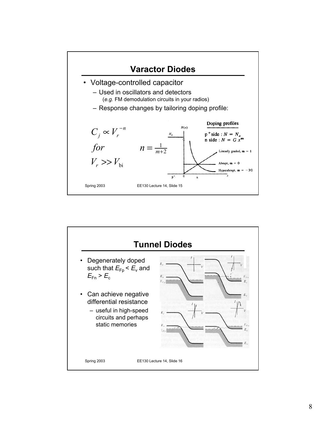 8 . Varactor Diodes • Voltage-controlled capacitor – Used in oscillators and detectors (e.g. FM demodulation circuits in your radios) – Response changes by tailoring doping profile: −n C j ∝ Vr for n= 1 m+2 Vr >> Vbi Spring 2003 EE130 Lecture 14, Slide 15 Tunnel Diodes • Degenerately doped such that EFp < Ev and EFn > Ec • Can achieve negative differential resistance – useful in high-speed circuits and perhaps static memories Spring 2003 EE130 Lecture 14, Slide 16 8