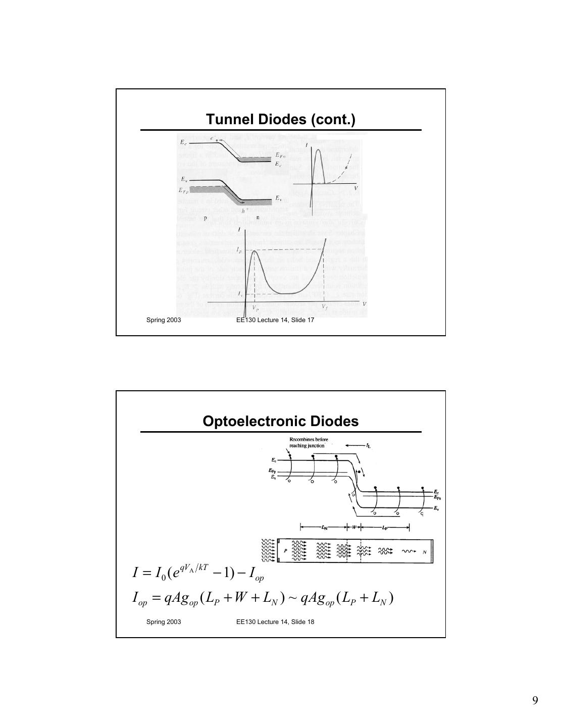 9 . Tunnel Diodes (cont.) Spring 2003 EE130 Lecture 14, Slide 17 Optoelectronic Diodes I = I 0 ( e qVA kT − 1) − I op I op = qAg op ( LP + W + LN ) ~ qAg op ( LP + LN ) Spring 2003 EE130 Lecture 14, Slide 18 9