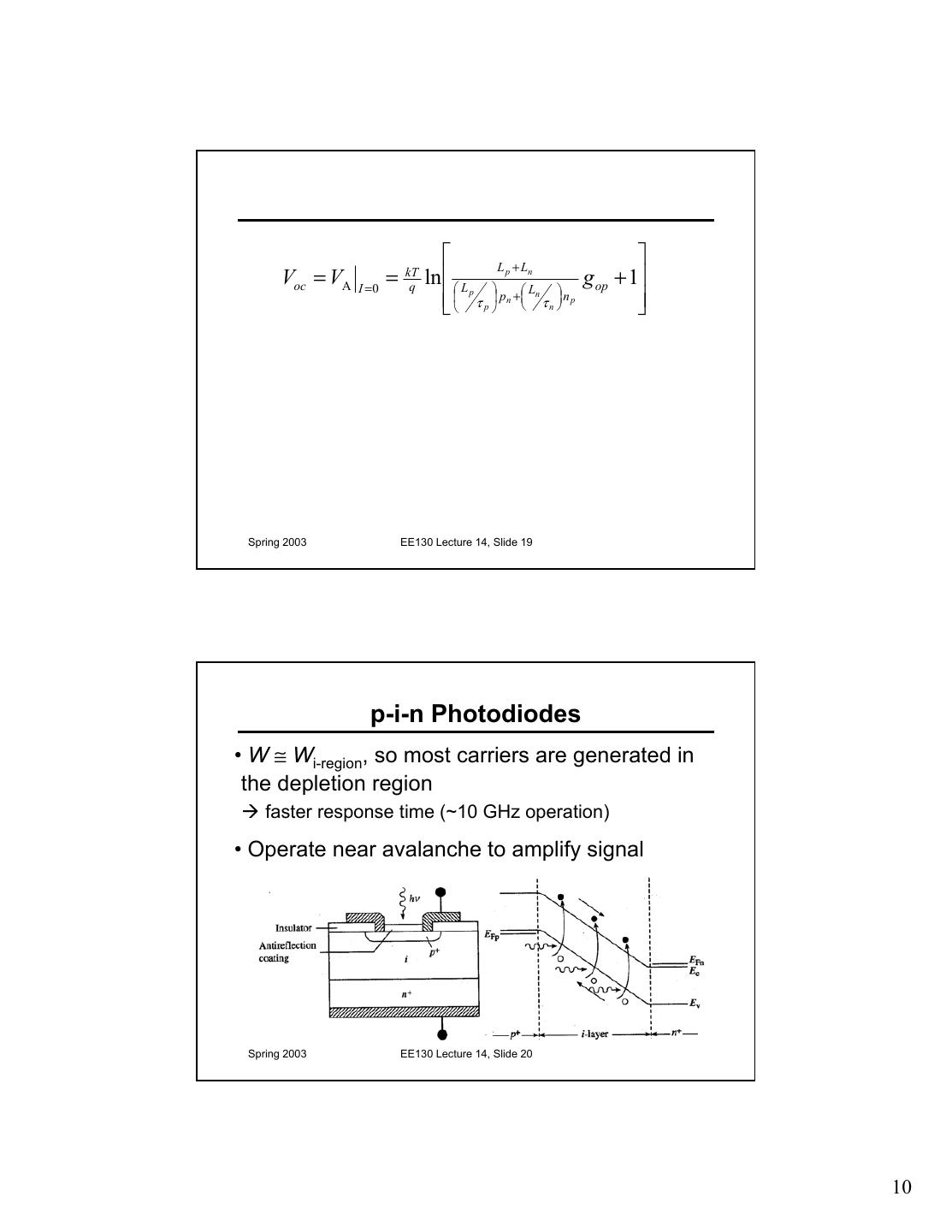 10 . L +L Voc = VA I =0 = kT q ln L p p nL g op + 1 τ p pn + n τ n n p Spring 2003 EE130 Lecture 14, Slide 19 p-i-n Photodiodes • W ≅ Wi-region, so most carriers are generated in the depletion region Æ faster response time (~10 GHz operation) • Operate near avalanche to amplify signal Spring 2003 EE130 Lecture 14, Slide 20 10