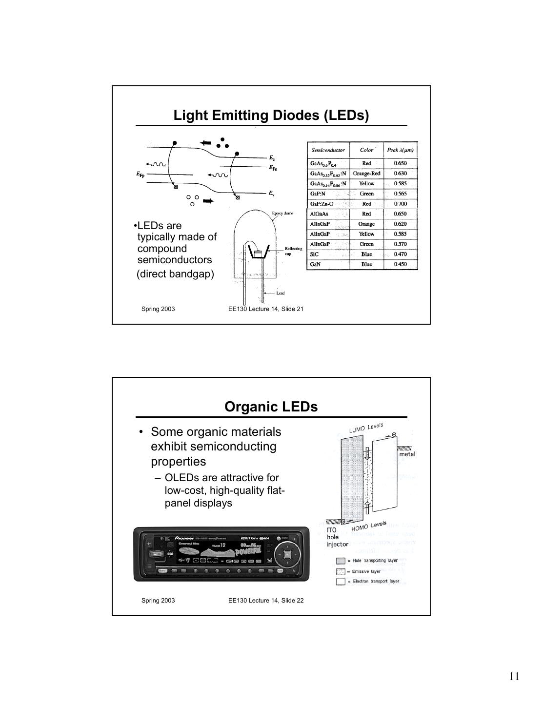 11 . Light Emitting Diodes (LEDs) •LEDs are typically made of compound semiconductors (direct bandgap) Spring 2003 EE130 Lecture 14, Slide 21 Organic LEDs • Some organic materials exhibit semiconducting properties – OLEDs are attractive for low-cost, high-quality flat- panel displays Spring 2003 EE130 Lecture 14, Slide 22 11