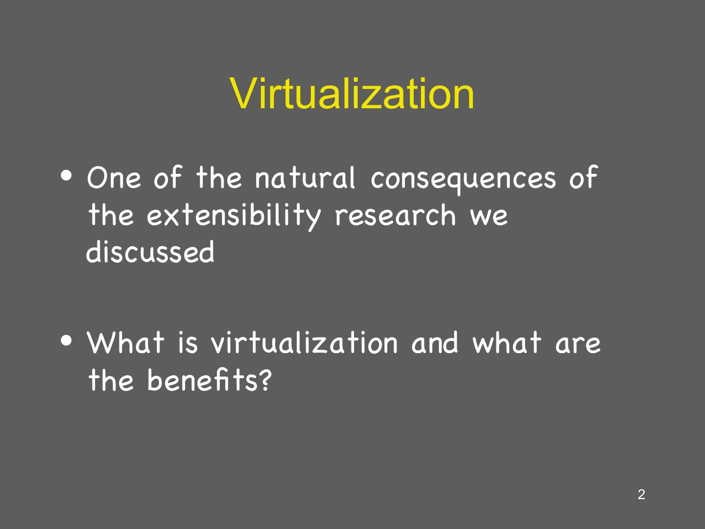 2 . Virtualization • One of the natural consequences of the extensibility research we discussed • What is virtualization and what are the benefits? 2