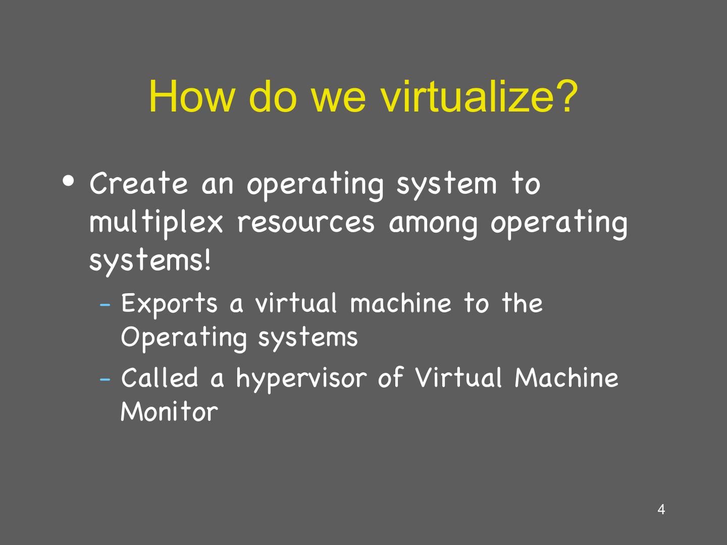 4 . How do we virtualize? • Create an operating system to multiplex resources among operating systems! – Exports a virtual machine to the Operating systems – Called a hypervisor of Virtual Machine Monitor 4
