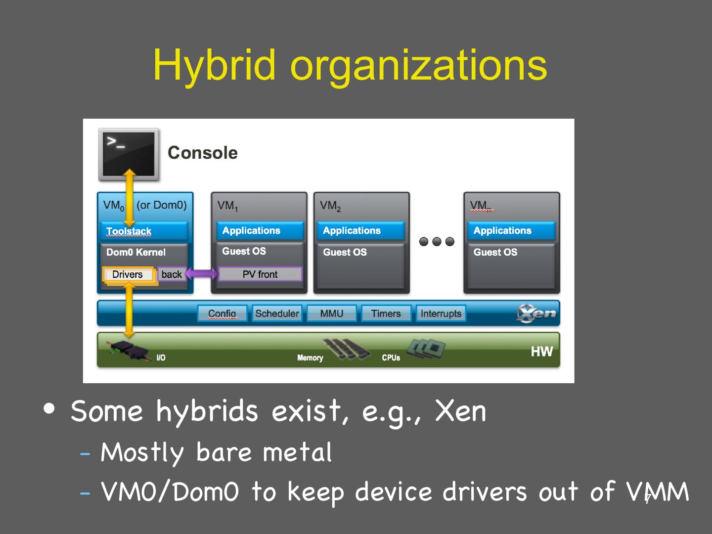 7 . Hybrid organizations • Some hybrids exist, e.g., Xen – Mostly bare metal – VM0/Dom0 to keep device drivers out of VMM 7