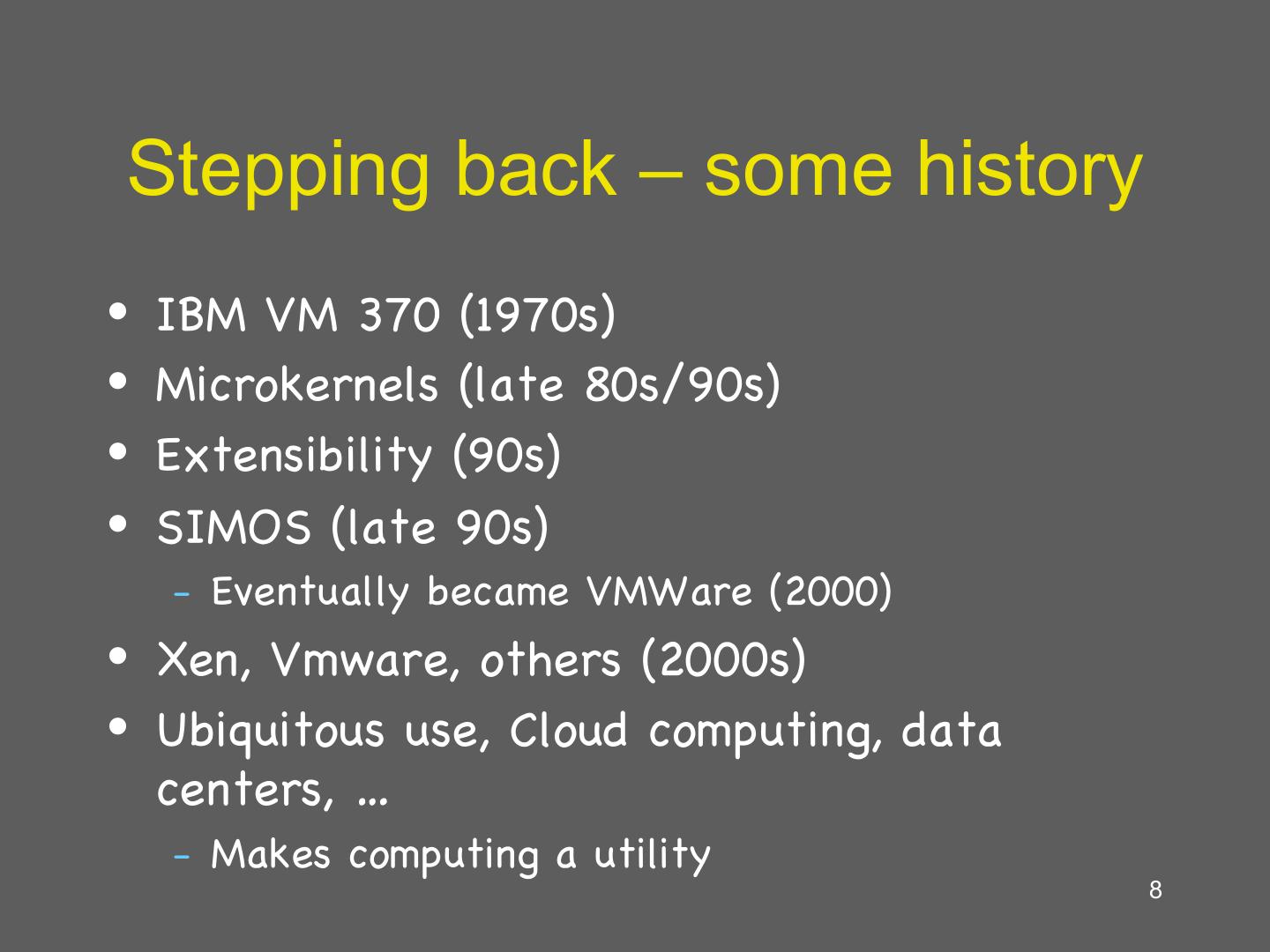 8 . Stepping back – some history • IBM VM 370 (1970s) • Microkernels (late 80s/90s) • Extensibility (90s) • SIMOS (late 90s) – Eventually became VMWare (2000) • Xen, Vmware, others (2000s) • Ubiquitous use, Cloud computing, data centers, … – Makes computing a utility 8