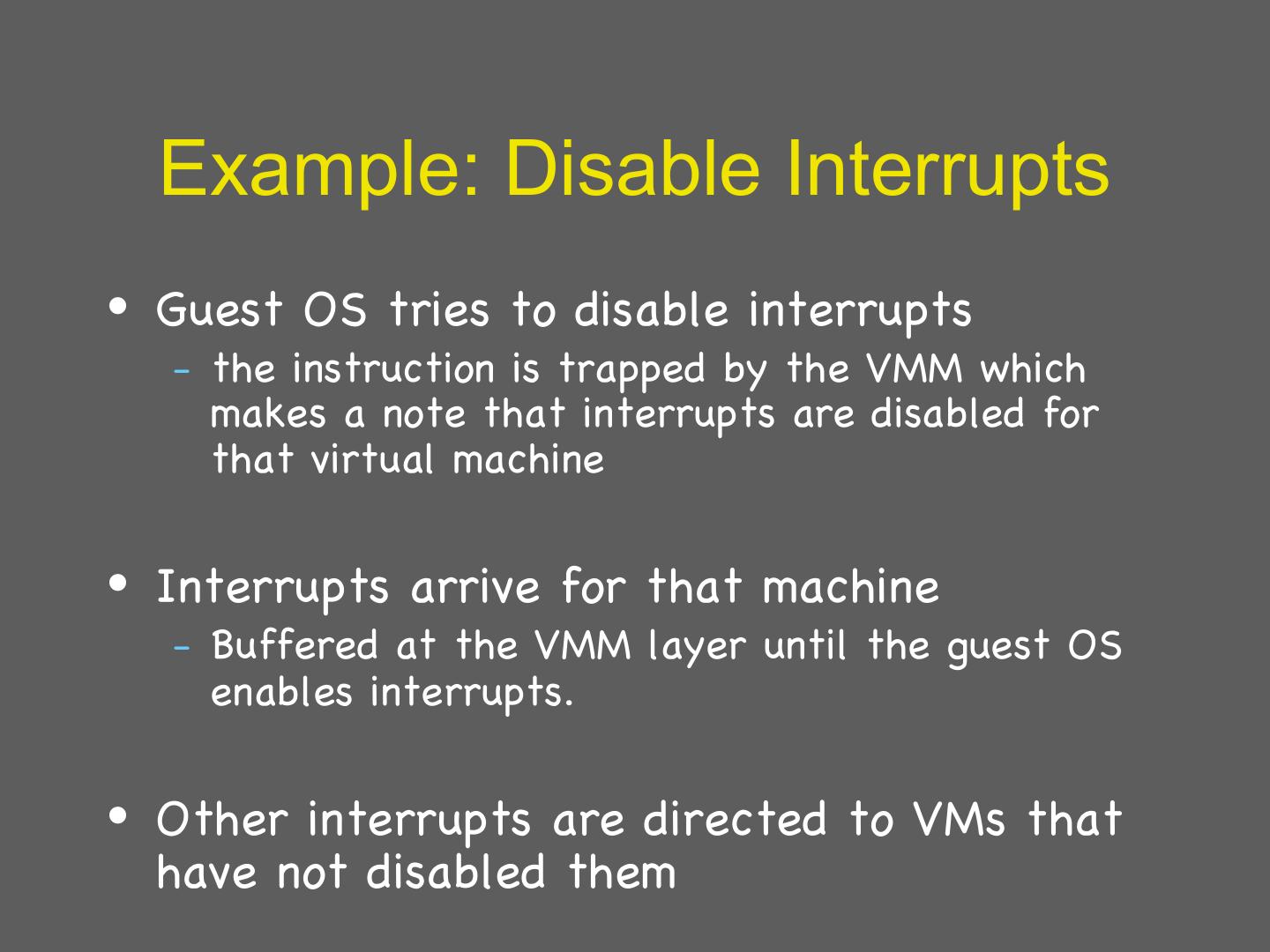 10 . Example: Disable Interrupts • Guest OS tries to disable interrupts – the instruction is trapped by the VMM which makes a note that interrupts are disabled for that virtual machine • Interrupts arrive for that machine – Buffered at the VMM layer until the guest OS enables interrupts. • Other interrupts are directed to VMs that have not disabled them