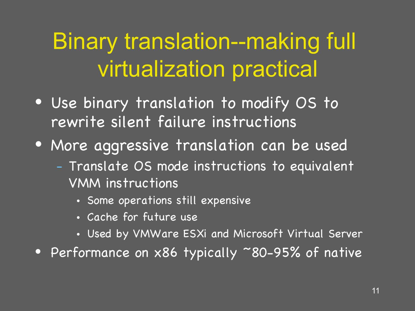11 . Binary translation--making full virtualization practical • Use binary translation to modify OS to rewrite silent failure instructions • More aggressive translation can be used – Translate OS mode instructions to equivalent VMM instructions • Some operations still expensive • Cache for future use • Used by VMWare ESXi and Microsoft Virtual Server • Performance on x86 typically ~80-95% of native 11