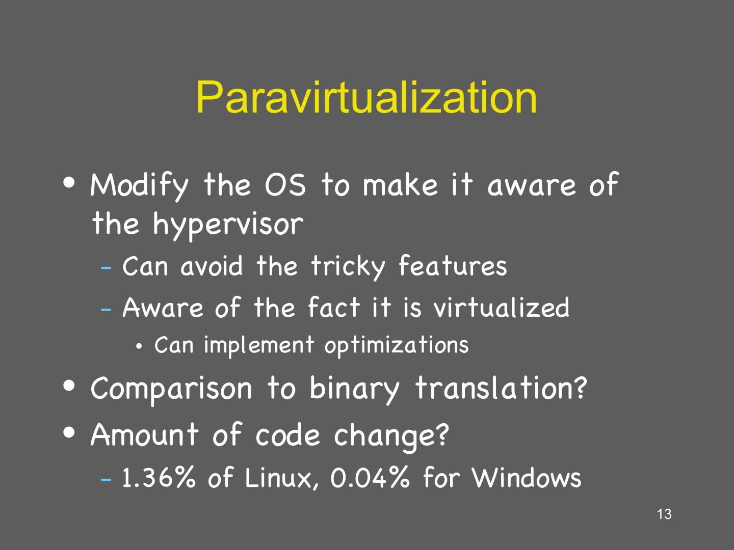 13 . Paravirtualization • Modify the OS to make it aware of the hypervisor – Canavoid the tricky features – Aware of the fact it is virtualized • Can implement optimizations • Comparison to binary translation? • Amount of code change? – 1.36% of Linux, 0.04% for Windows 13