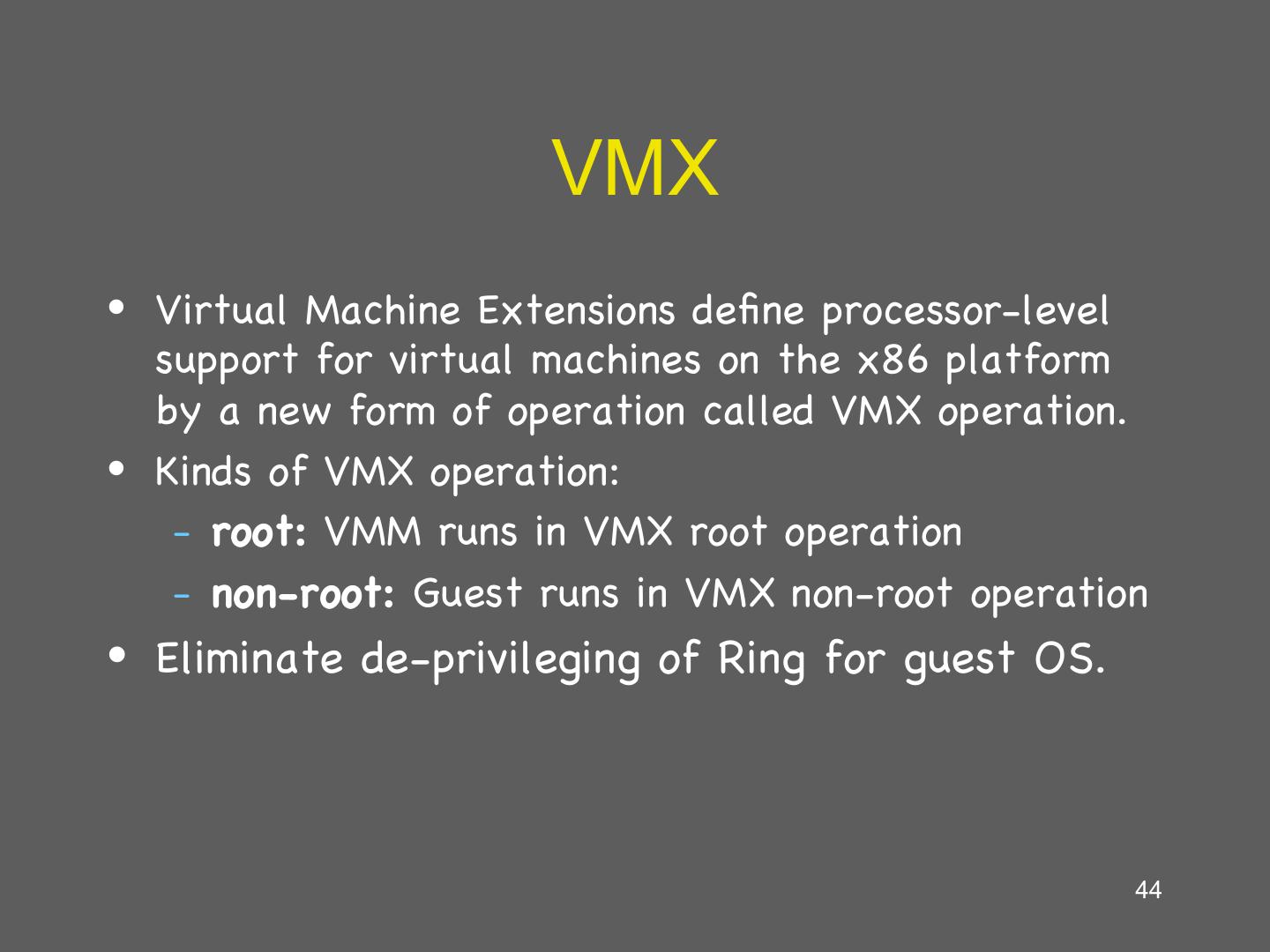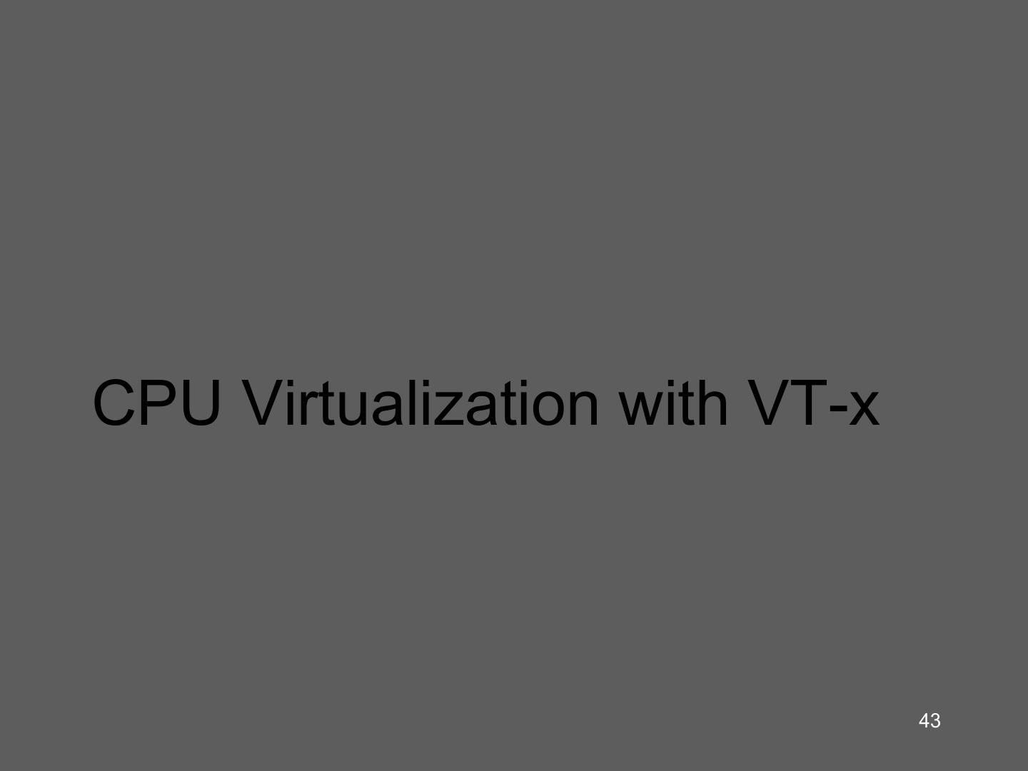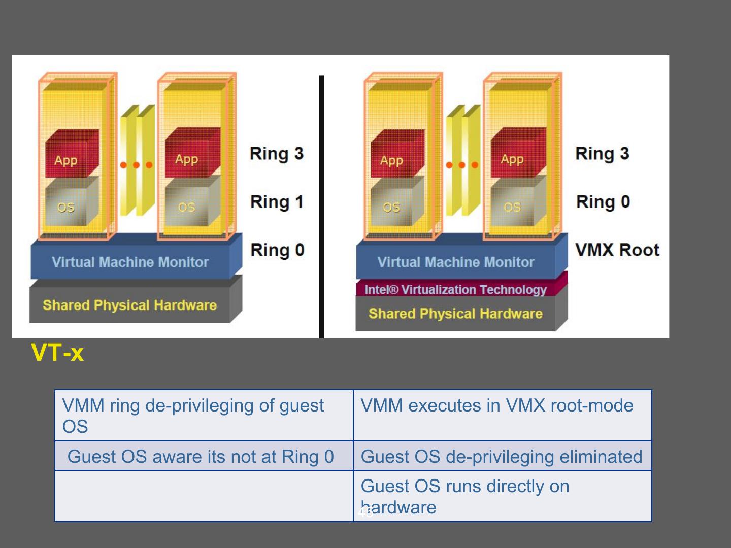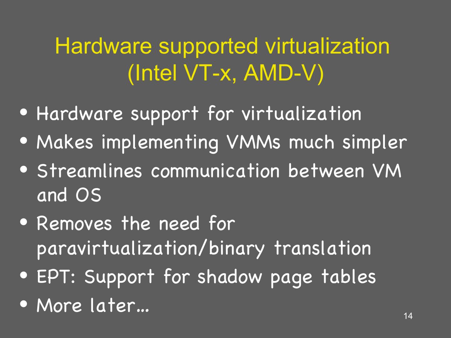 14 . Hardware supported virtualization (Intel VT-x, AMD-V) • Hardware support for virtualization • Makes implementing VMMs much simpler • Streamlines communication between VM and OS • Removes the need for paravirtualization/binary translation • EPT: Support for shadow page tables • More later… 14