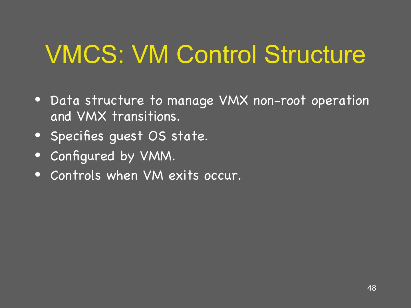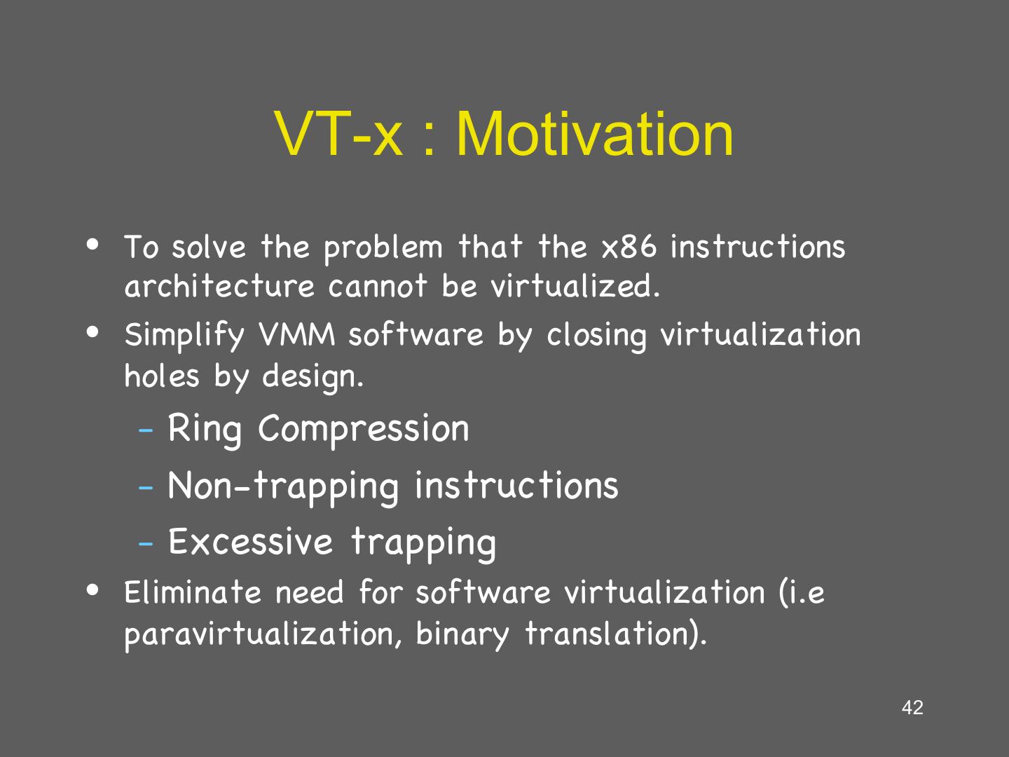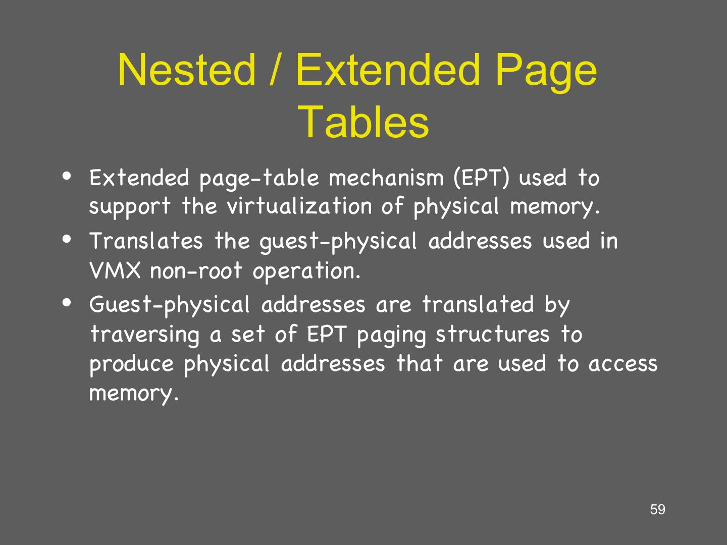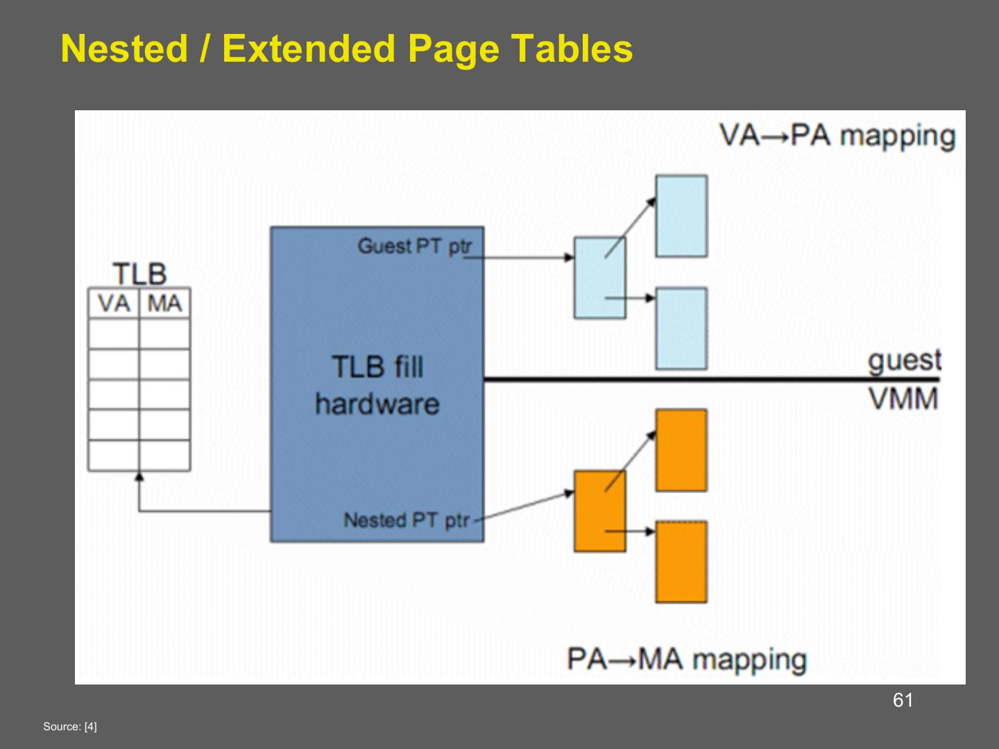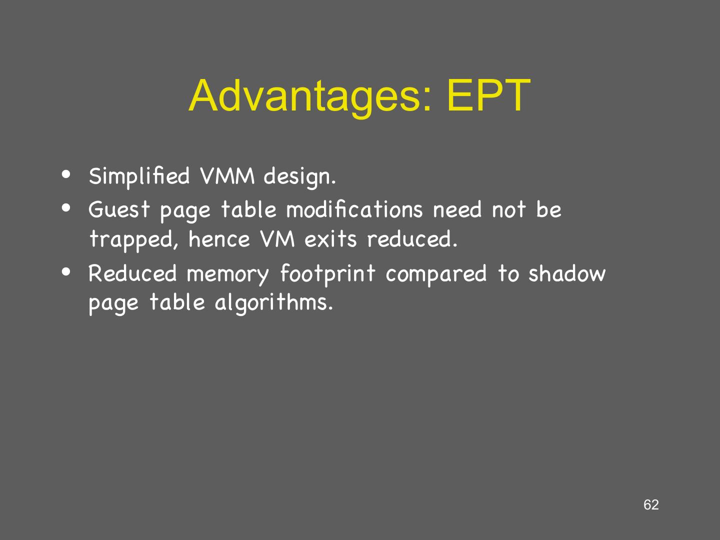 14 . Hardware supported virtualization (Intel VT-x, AMD-V) • Hardware support for virtualization • Makes implementing VMMs much simpler • Streamlines communication between VM and OS • Removes the need for paravirtualization/binary translation • EPT: Support for shadow page tables • More later… 14
