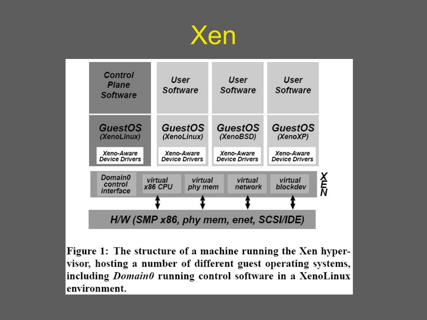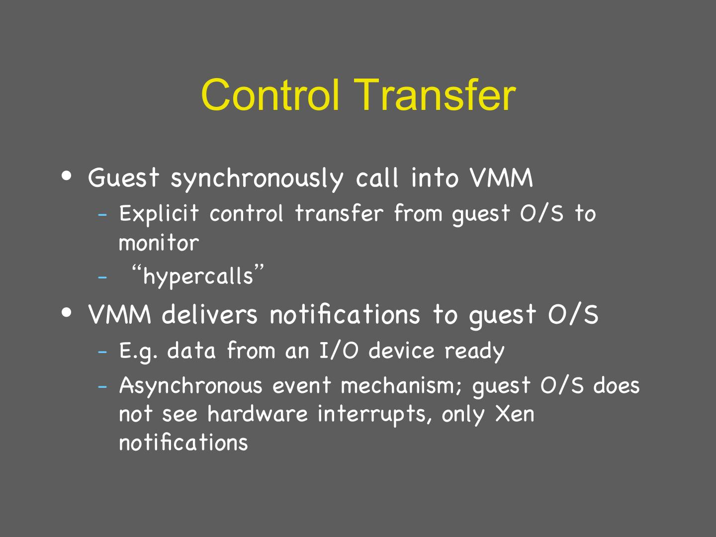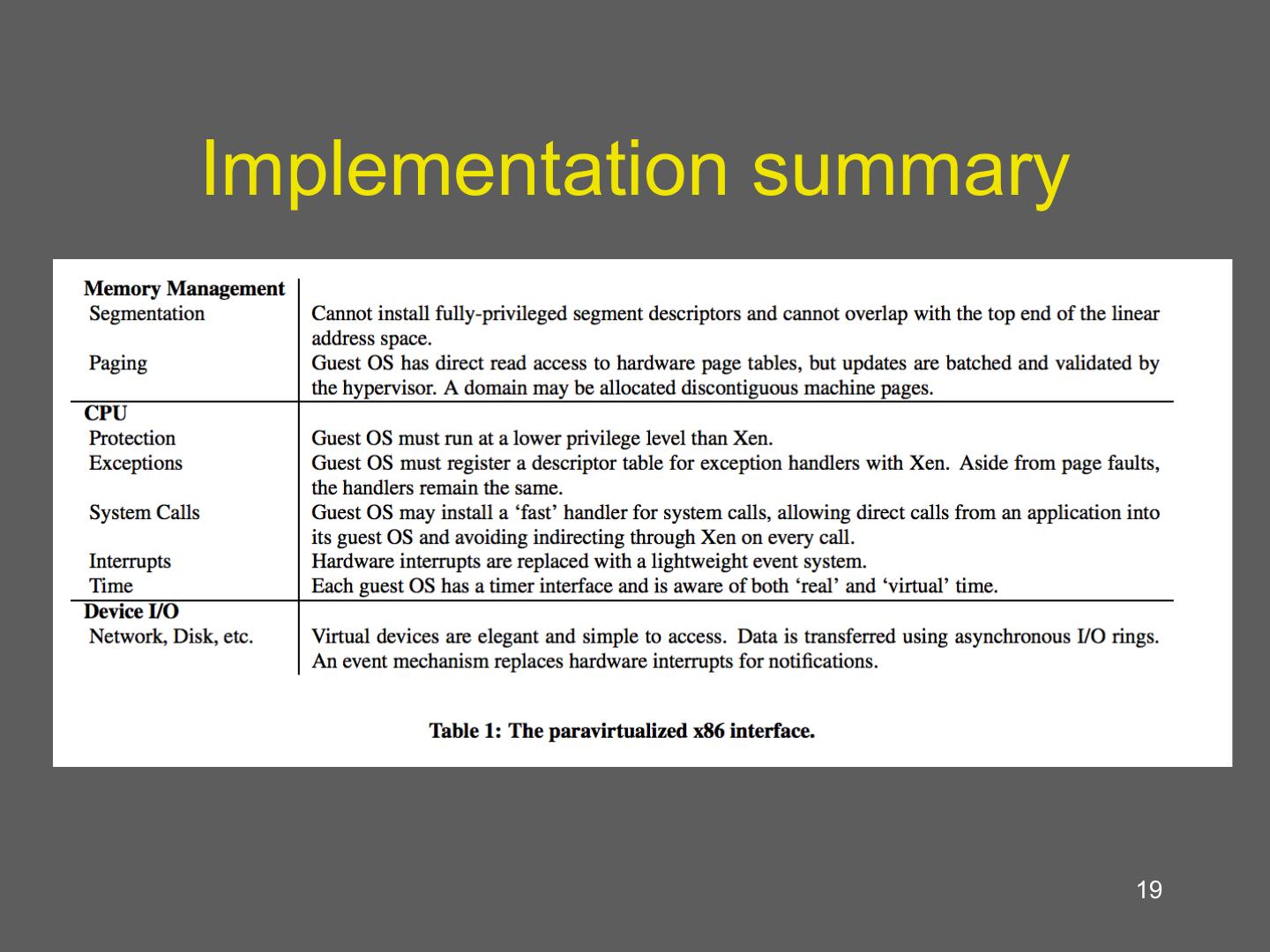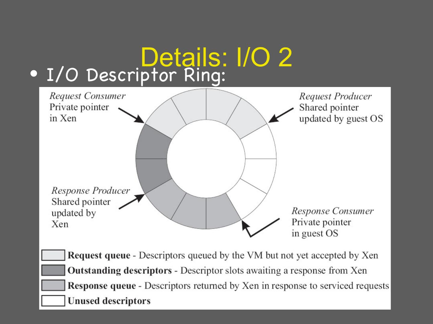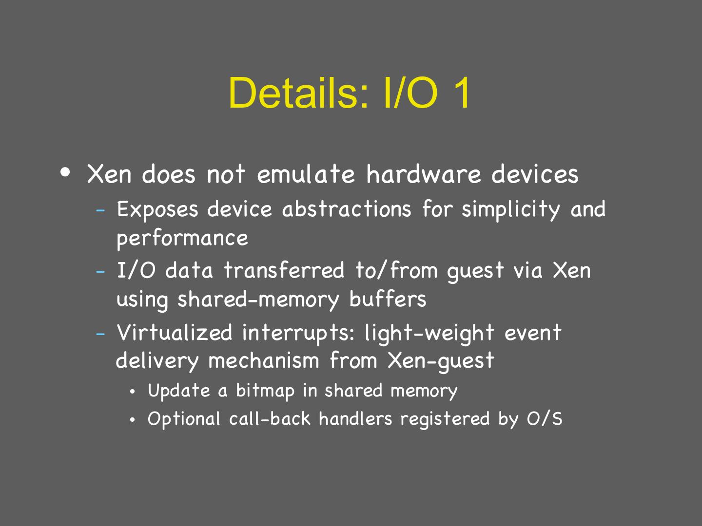 29 . Details: I/O 1 • Xen does not emulate hardware devices – Exposes device abstractions for simplicity and performance – I/O data transferred to/from guest via Xen using shared-memory buffers – Virtualized interrupts: light-weight event delivery mechanism from Xen-guest • Update a bitmap in shared memory • Optional call-back handlers registered by O/S