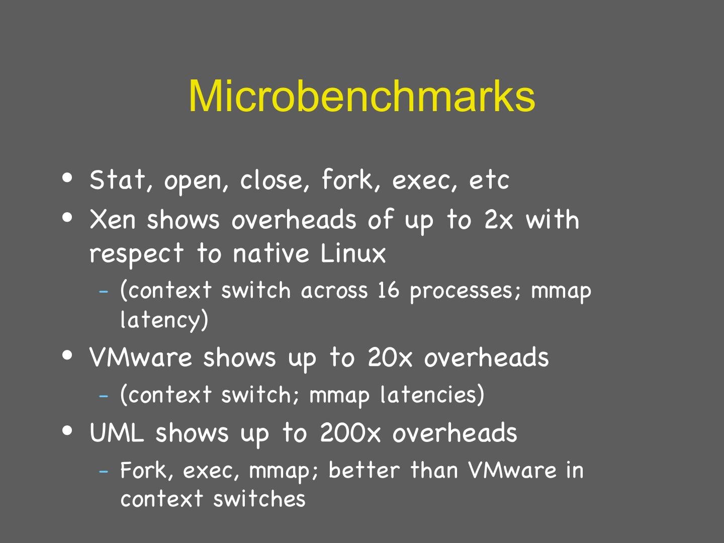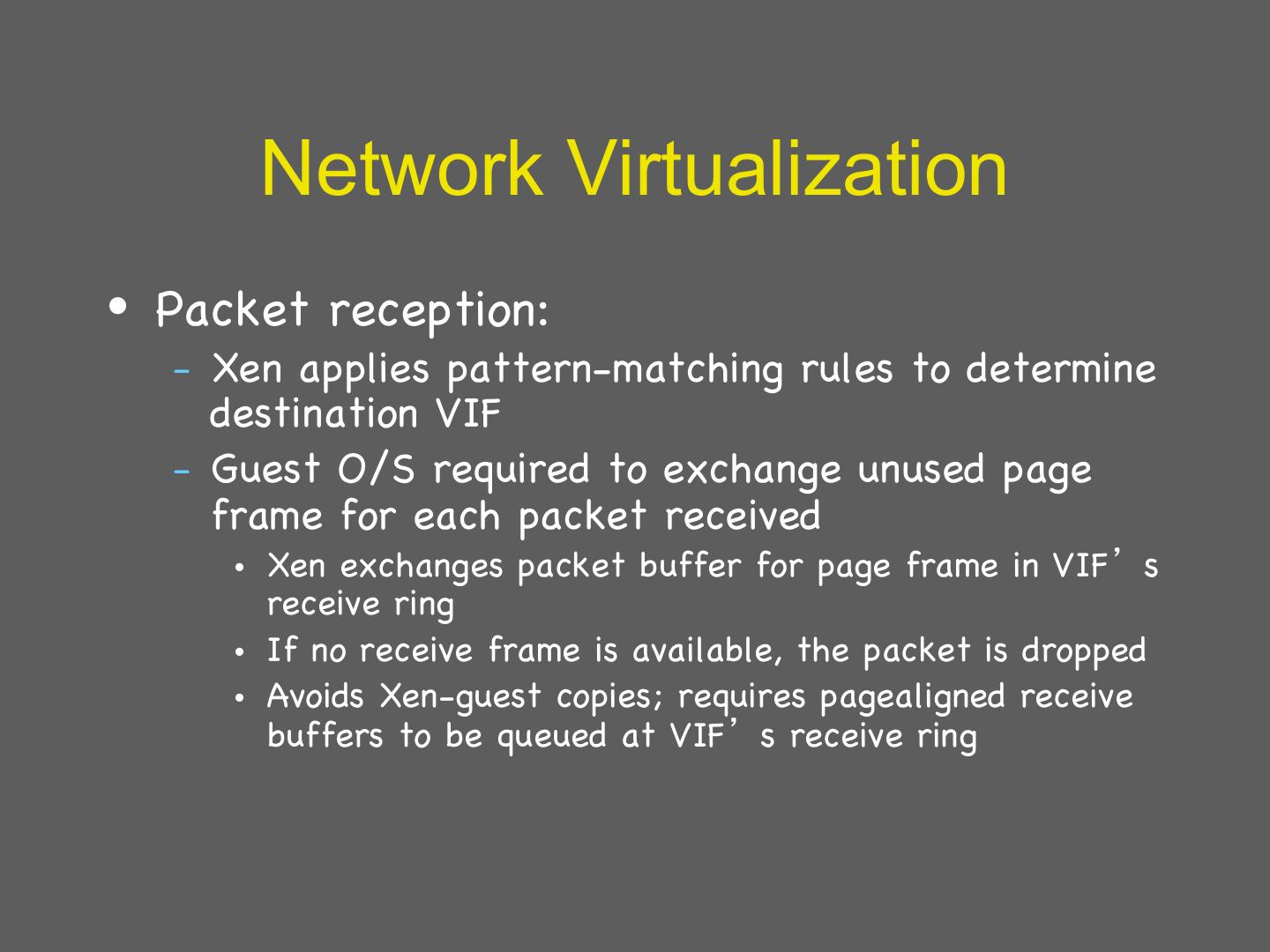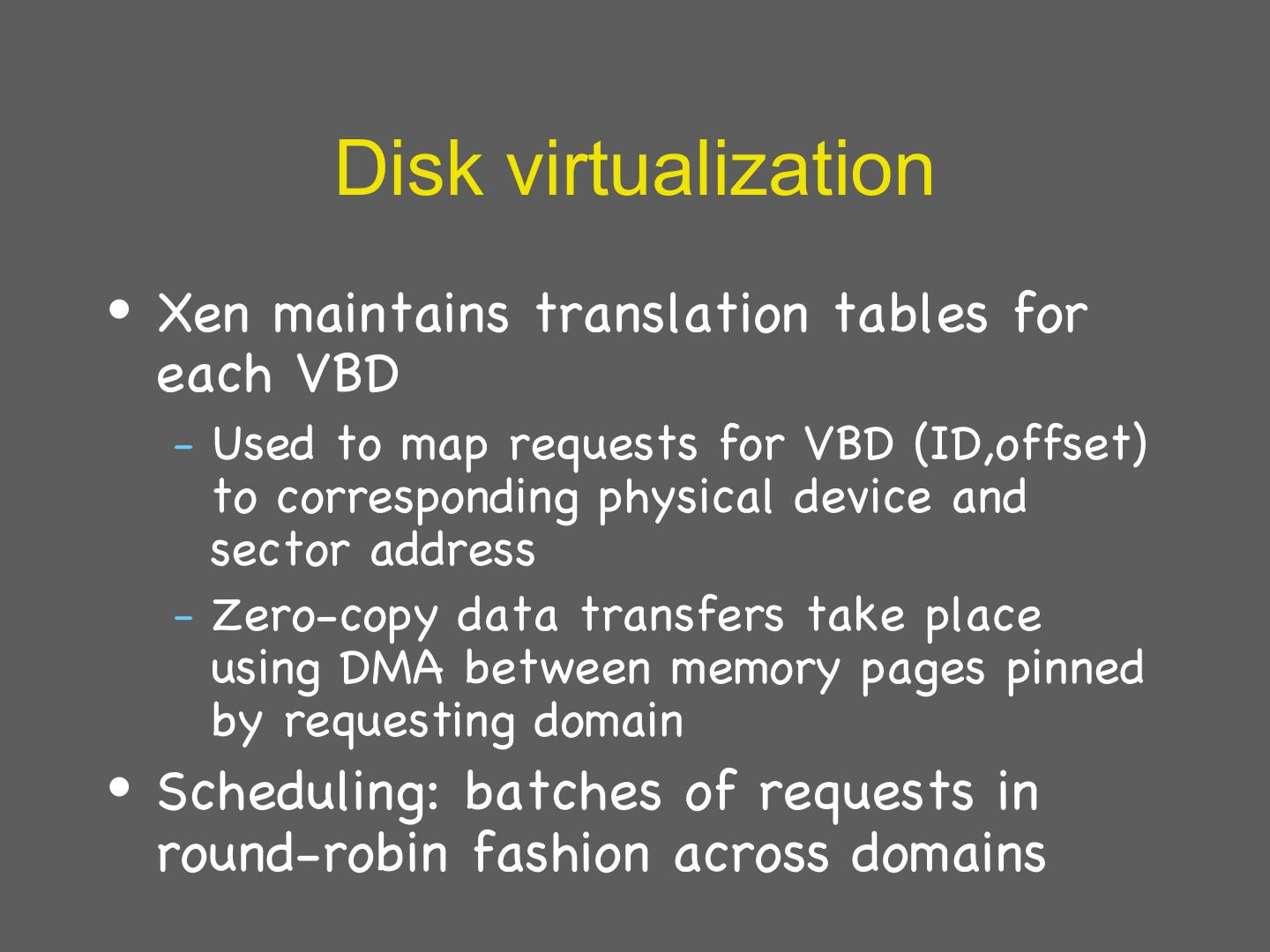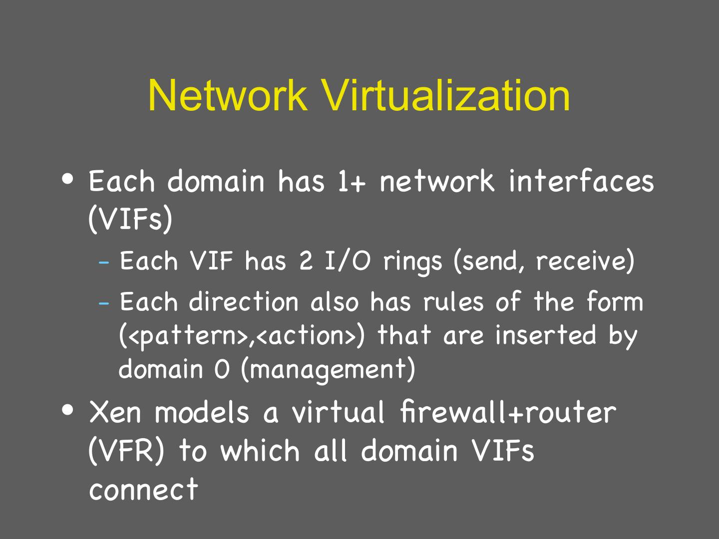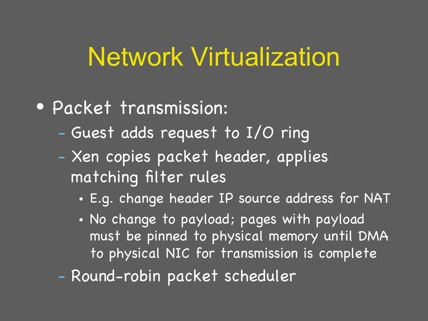 29 . Details: I/O 1 • Xen does not emulate hardware devices – Exposes device abstractions for simplicity and performance – I/O data transferred to/from guest via Xen using shared-memory buffers – Virtualized interrupts: light-weight event delivery mechanism from Xen-guest • Update a bitmap in shared memory • Optional call-back handlers registered by O/S