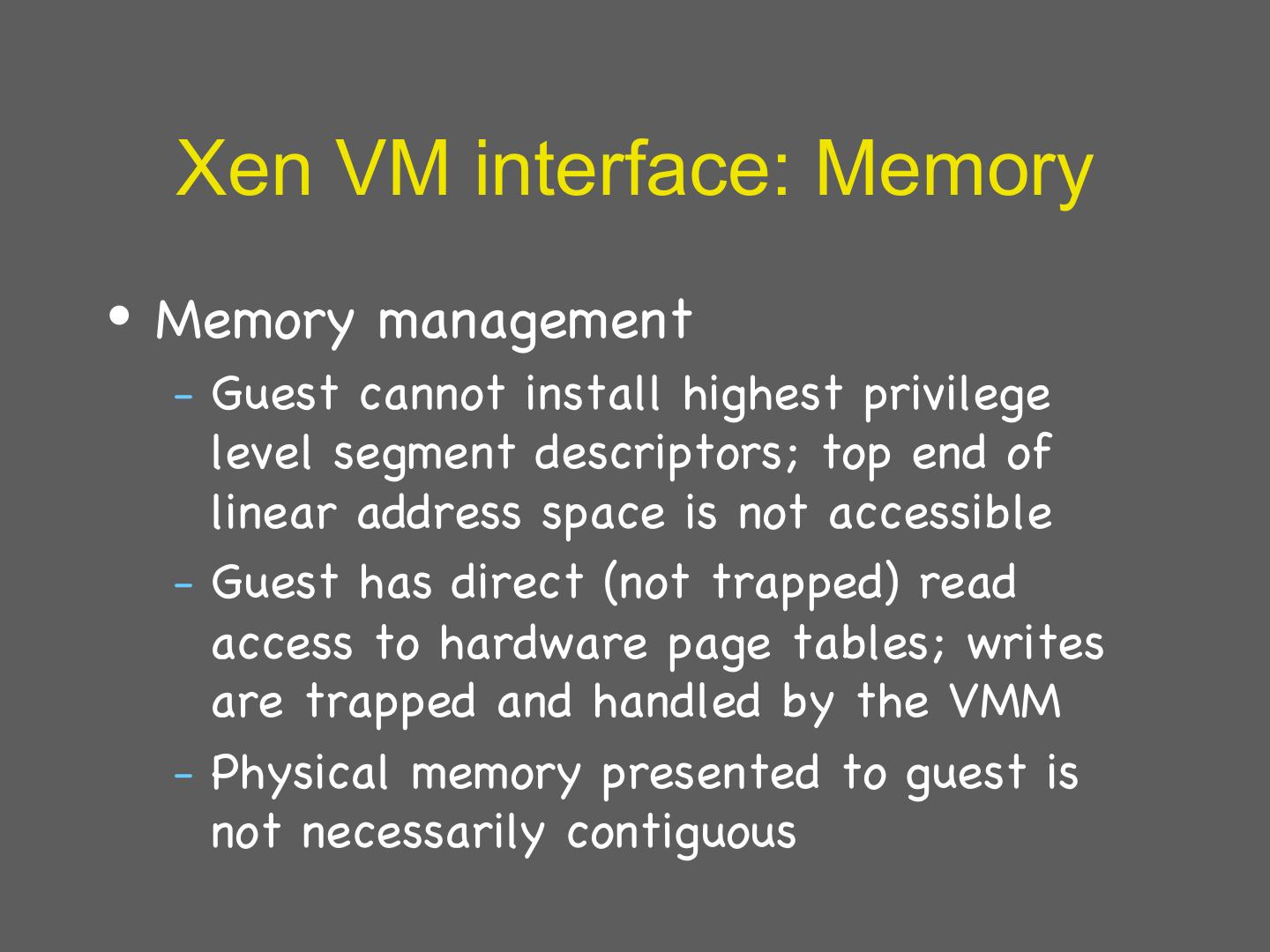 20 . Xen VM interface: Memory • Memory management – Guest cannot install highest privilege level segment descriptors; top end of linear address space is not accessible – Guest has direct (not trapped) read access to hardware page tables; writes are trapped and handled by the VMM – Physical memory presented to guest is not necessarily contiguous