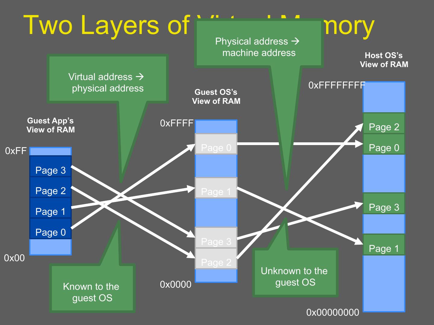 21 . Two Layers of Virtual Memory Physical address à machine address Host OS’s View of RAM Virtual address à physical address 0xFFFFFFFF Guest OS’s View of RAM Guest App’s 0xFFFF View of RAM Page 2 0xFF Page 0 Page 0 Page 3 Page 2 Page 1 Page 1 Page 3 Page 0 Page 3 Page 1 0x00 Page 2 Unknown to the Known to the 0x0000 guest OS guest OS 0x00000000